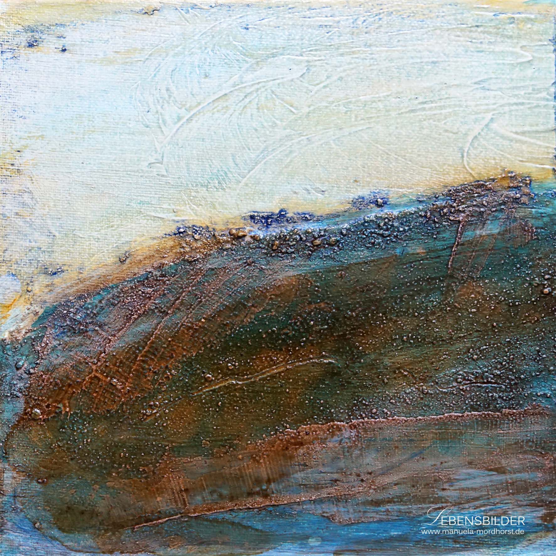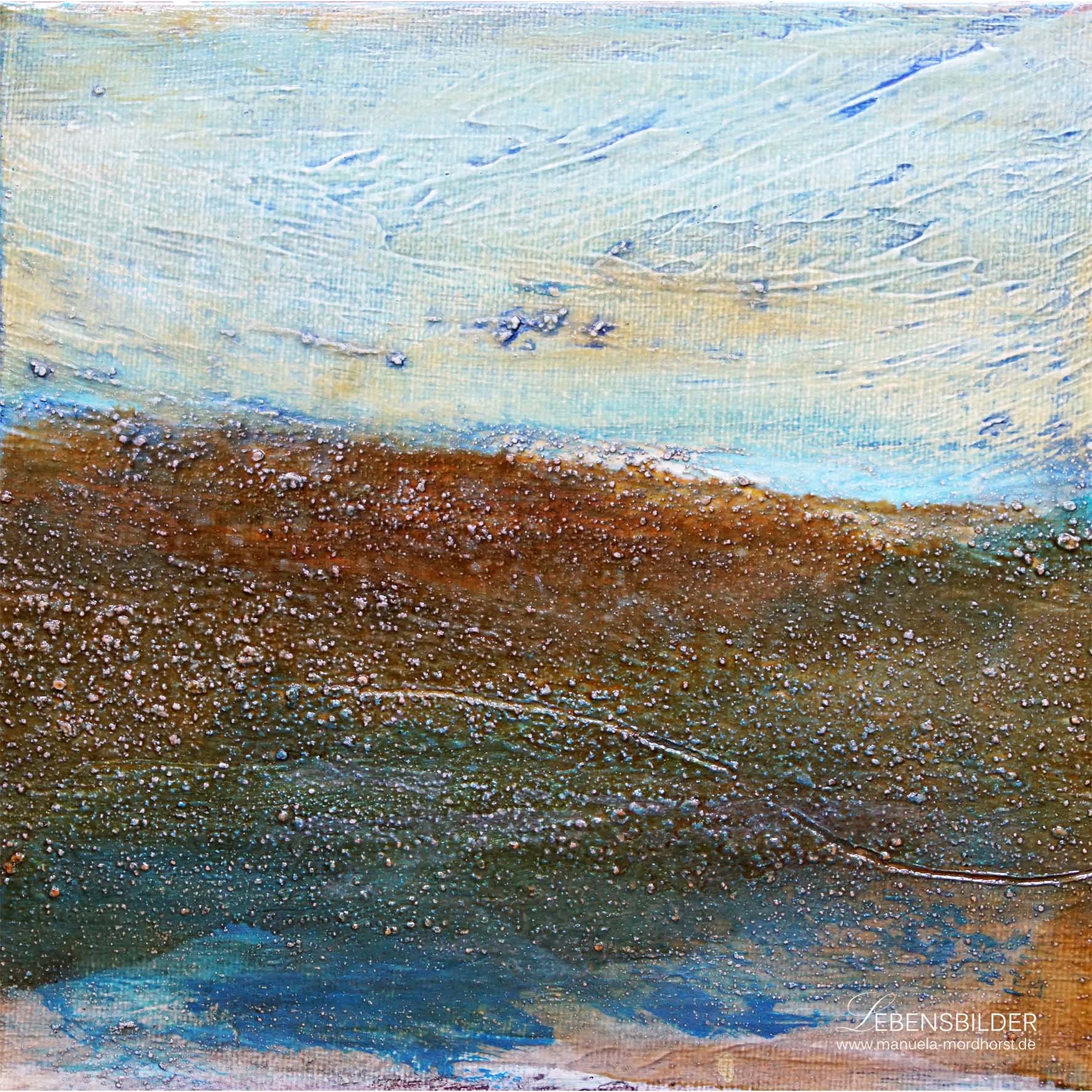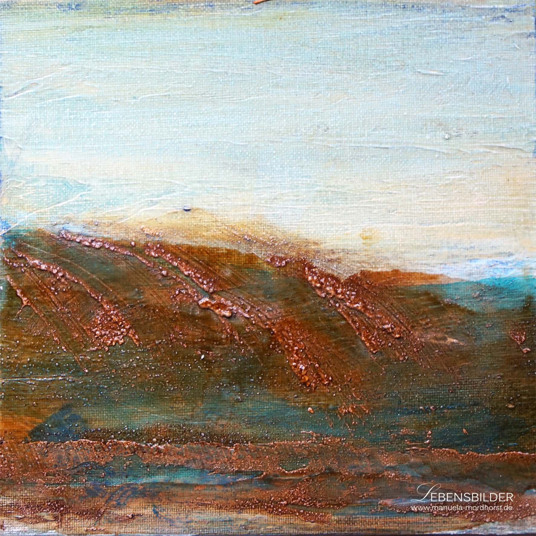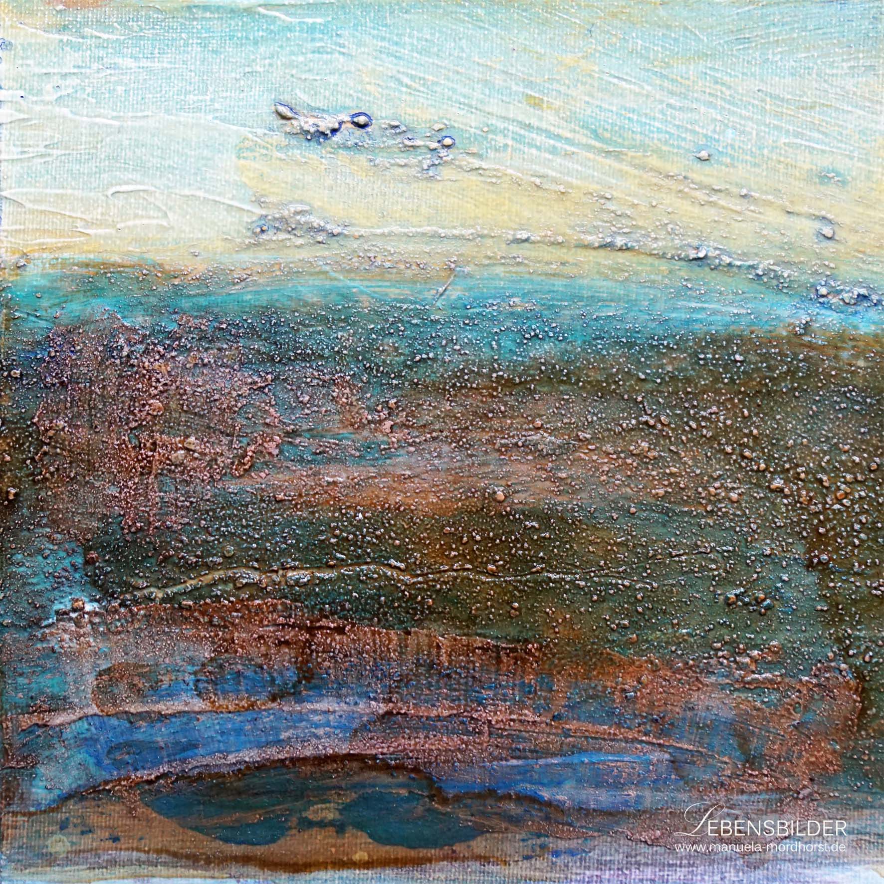 Das Malen in dieser Form von Serie, dass ich mir 6 Malcartonagen oder mehr nebeneinander lege und dann einfach so „wirke“ war für mich mal eine neue Form der Serienverarbeitung. Interessant fand ich dabei für mich wiederum die Dynamik, die entsteht und wie man sich dem puren Gefühl aus Erinnerung, Gerüchen und Eindrücken hingeben kann, sodass daraus etwas ganz Impulsives entstehen darf, das für sich in der Gesamtheit, aber auch einzeln sprechen und ansprechen darf.