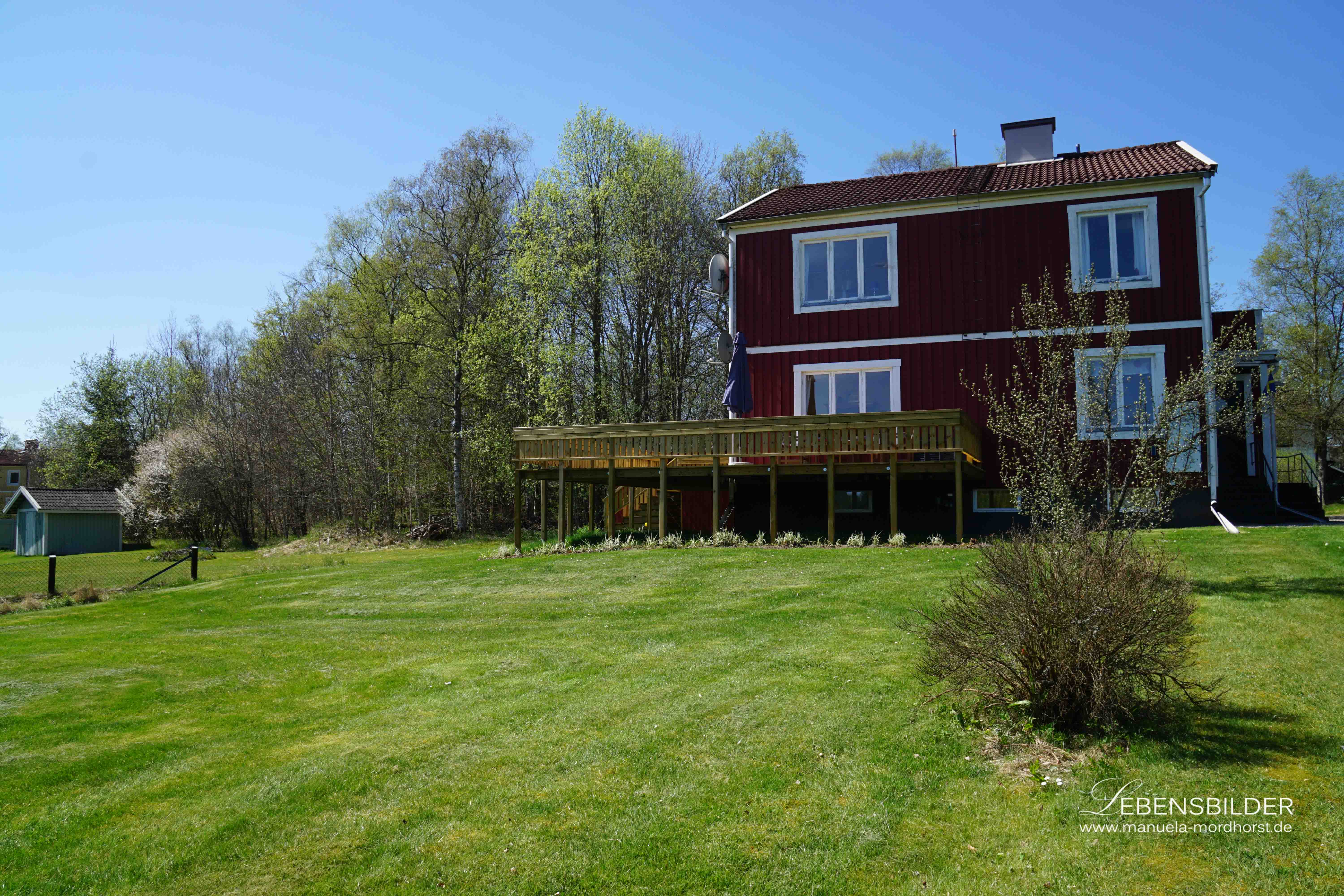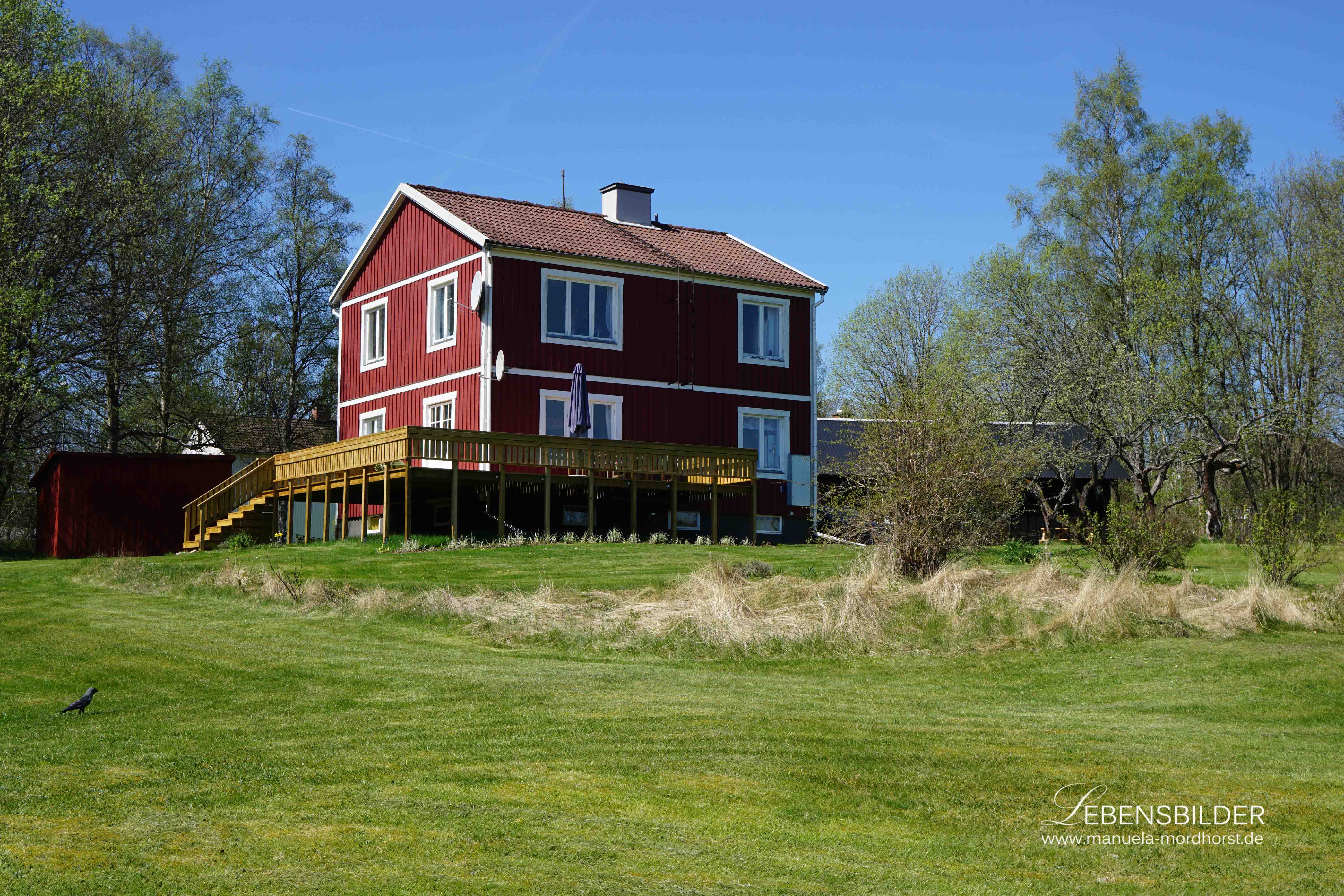 Ich lebe dazu in Kosta in einem typisch schwedischen Faluröd Holzhaus und im Hintergrund ist Kosta mit seinen Glasbläsereien und der vielfältigen Glaskunst.