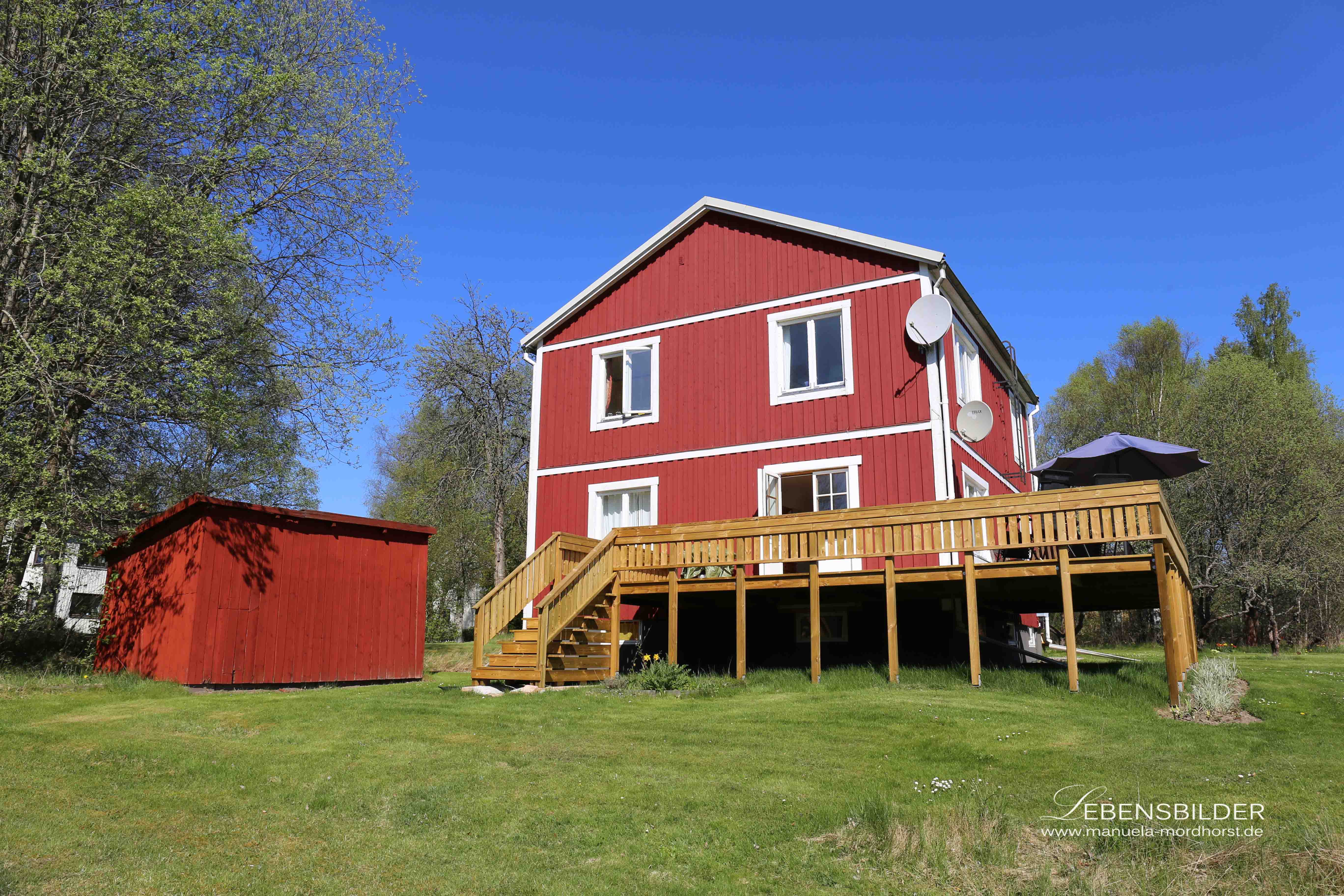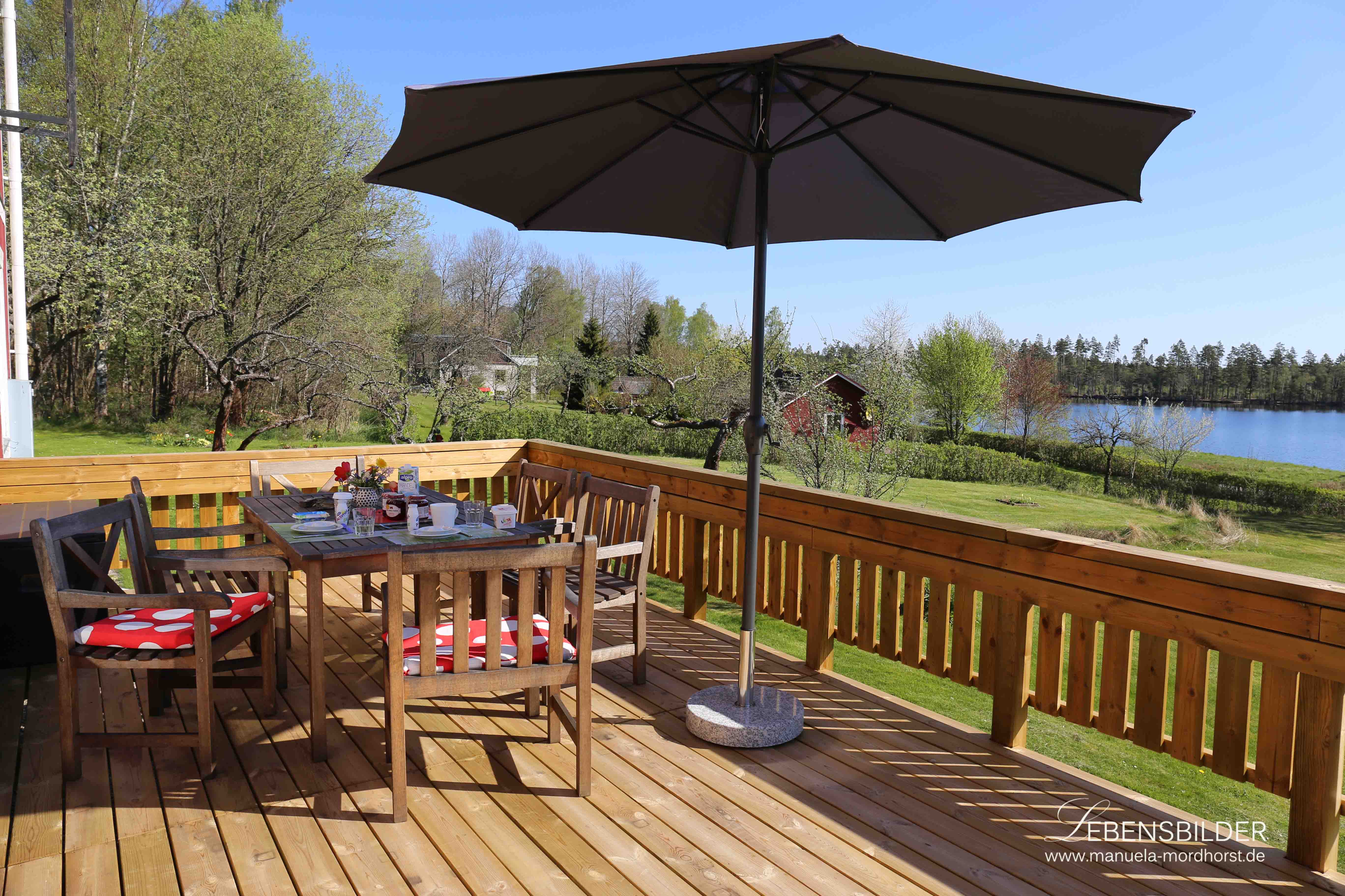 Ich bin extra hier, um die Natur, die Umgebung, die Kunst, den wunderschönen See BlÃ¥göl vor dem Haus auf mich wirken zu lassen und nach aller Hektik des Alltags zu einer inneren Ruhe zurück zu finden. Ich freue mich jeden Tag darüber, dass ich das kann, dass ich hier sein kann, und einfach auch mal das beherzige, was ich oftmals meinen Klienten und Kunden auch sage, dass sie nämlich mal eine Oase für sich erschaffen dürfen, in der sie SIE selbst sein dürfen, mal ohne jedes Gefühl von Pflicht, von Arbeit, von Schaffenmüssen, selbst auferlegten Zwängen usw. Seit meiner Ankunft werde ich hier von der Sonne verwöhnt, kann draussen auf der Terrasse meinen Blick über den See streifen lassen,wie sich die Bäume in ihm spiegeln, oder wie die Sonne früh morgens um 4.50h hier über ihm aufgeht, ein wunderbares Schauspiel ist das.
