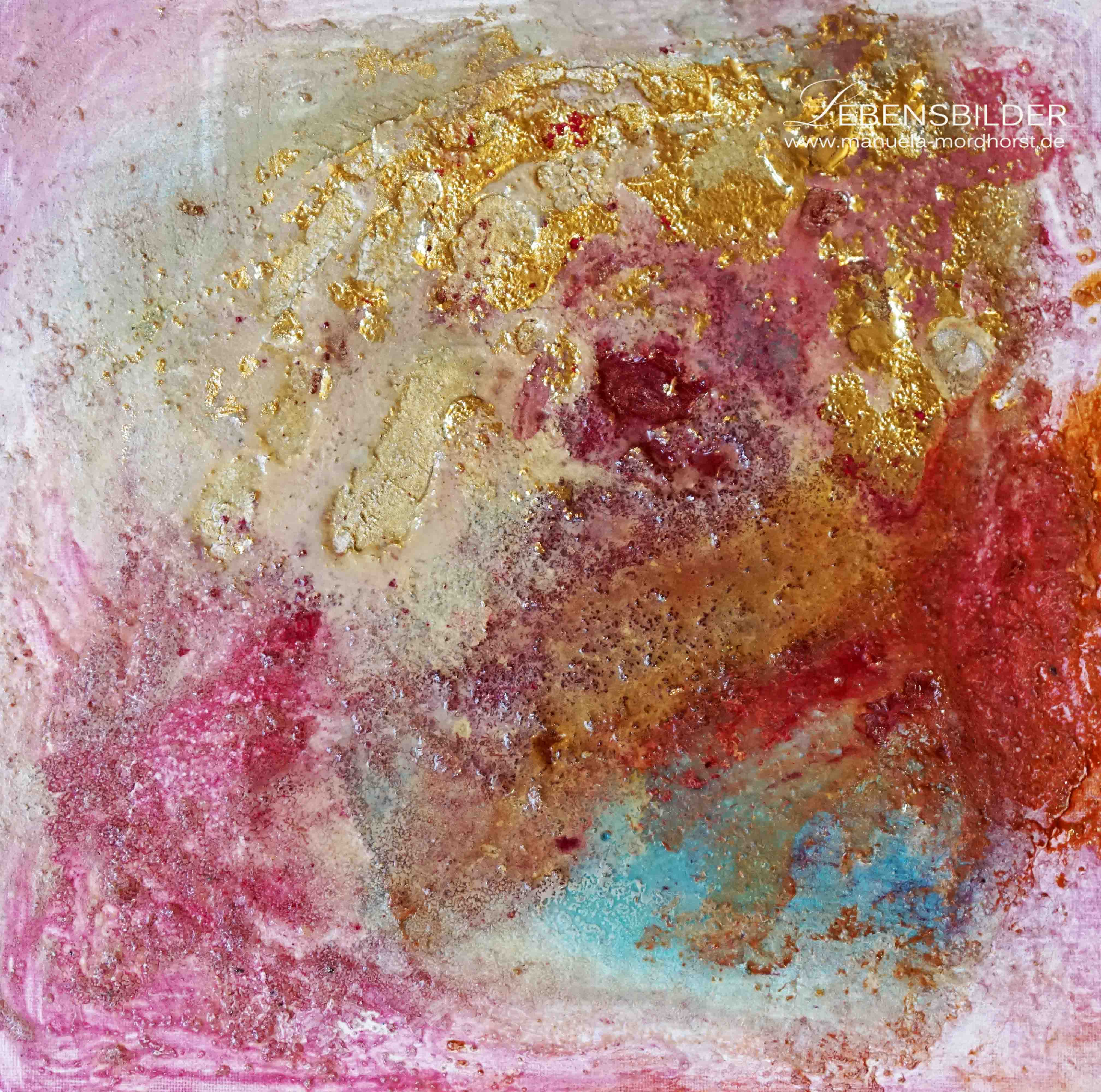Das erste Bild habe ich „Rosa Kyss“ (schwedisch) genannt „Pinker Kuss“, wegen der frischen Farben in dem Bild und die Leichtigkeit, die sich bei mir so einstellte, während ich es malte (und den Gestank ausblendete, während ich den Leim über das Bild laufen ließ). Na und weil ich mich an zarte Lippenstiftküsse erinnerte. Was einem manchmal eben so in den Sinn kommt 🙂