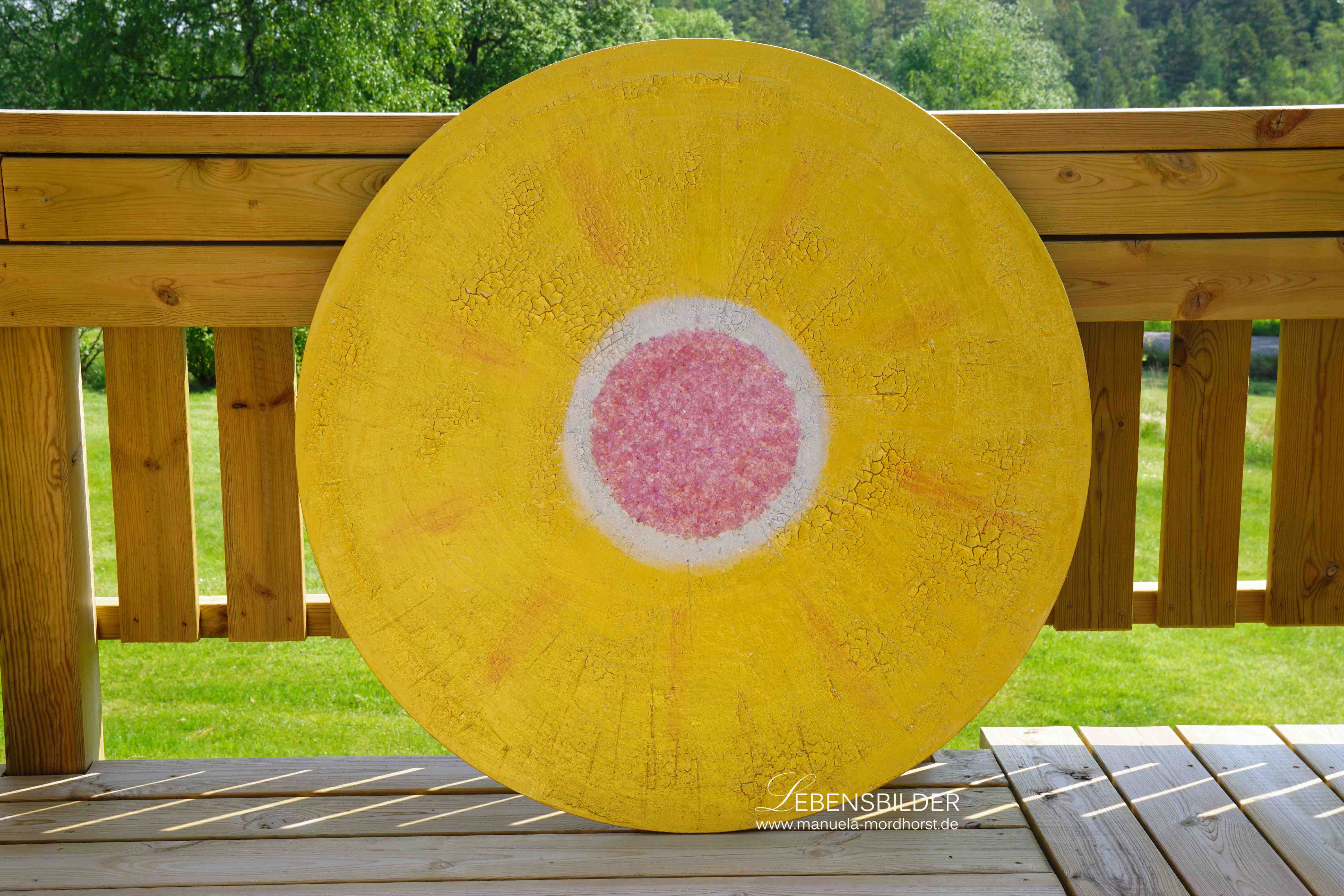 Eines davon ist das Bild „Kraft des Herzen“. Die Titel entstehen meist, sobald ein Bild wirklich fertig gemalt ist und ergeben sich dann oft auch intuitiv. Ich habe dieses Bild, wie auch alle anderen, oft herausgeholt in Schweden und auf der Terrasse aufgestellt und einfach betrachtet, um es auf mich wirken zu lassen, ob es fertig ist, ob es noch etwas bearbeitet werden muss, ob es genügend Leuchtkraft besitzt und und und…..