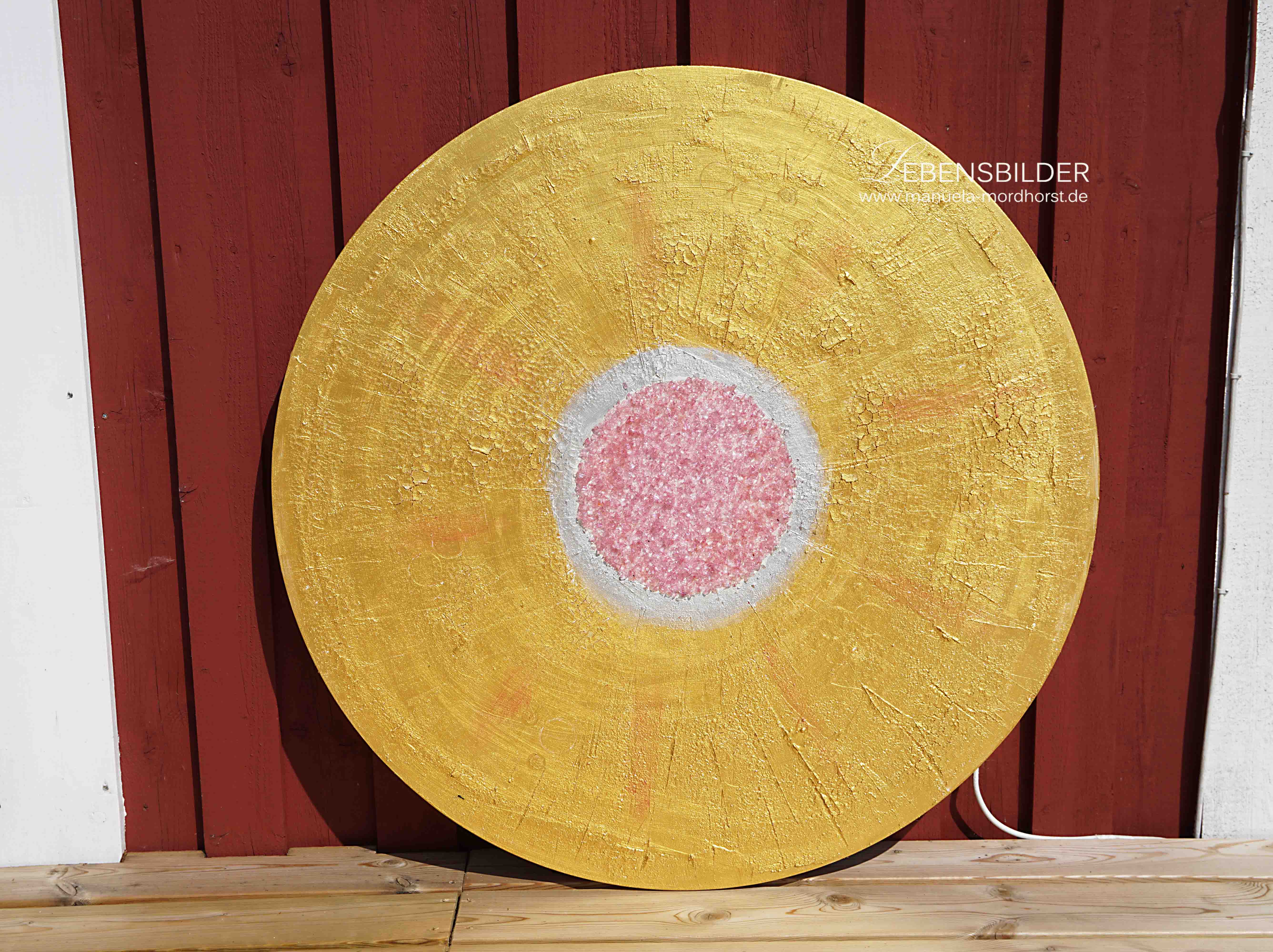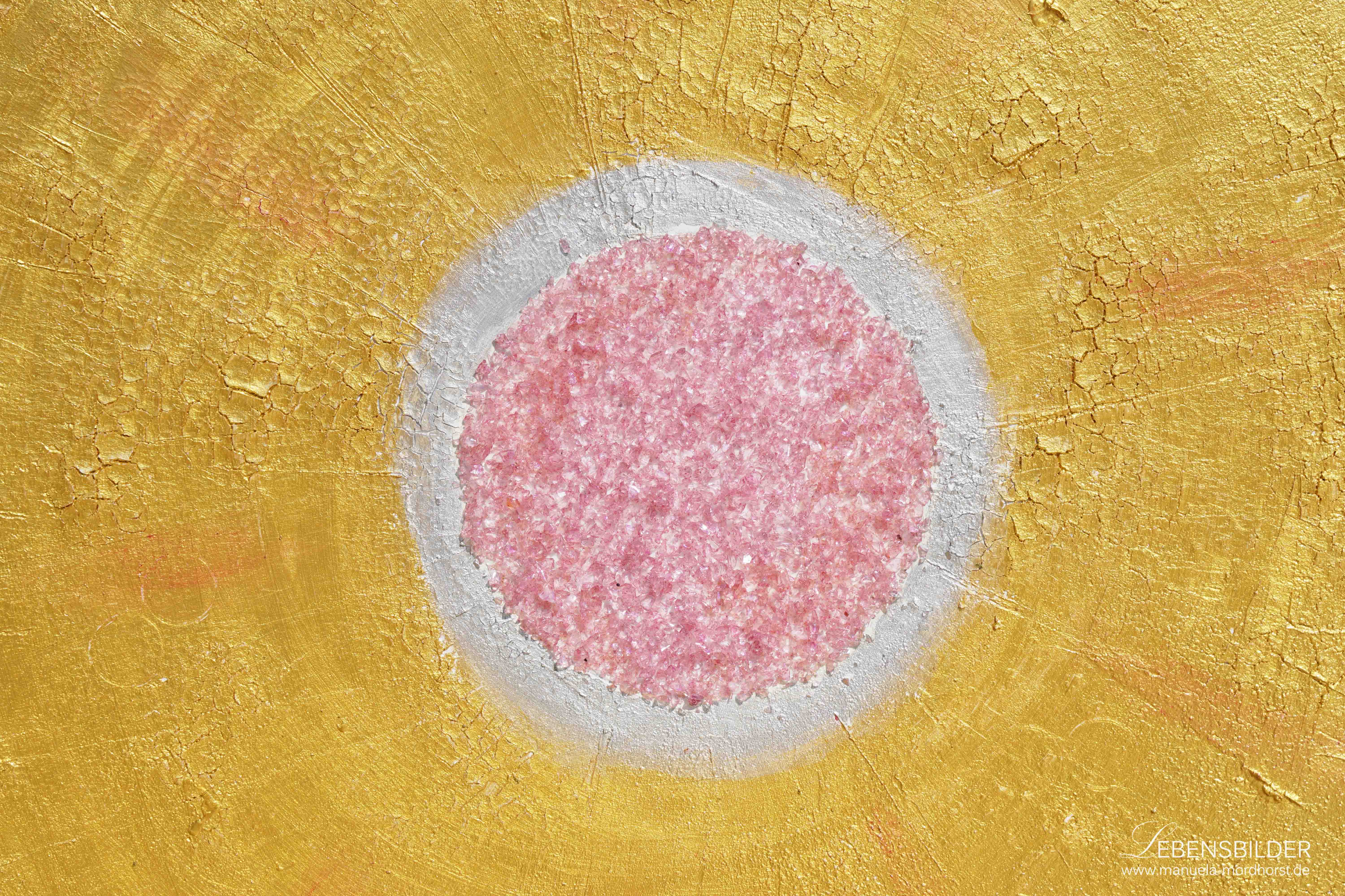 Diesem Werk liegen Marmormehl und Champagnerkreide zugrunde, darauf baut sich dann eine bestimmte und für mich unglaublich intensive Goldfarbe von Lascaux auf, als Highlight hier pinkfarbenes Glas.