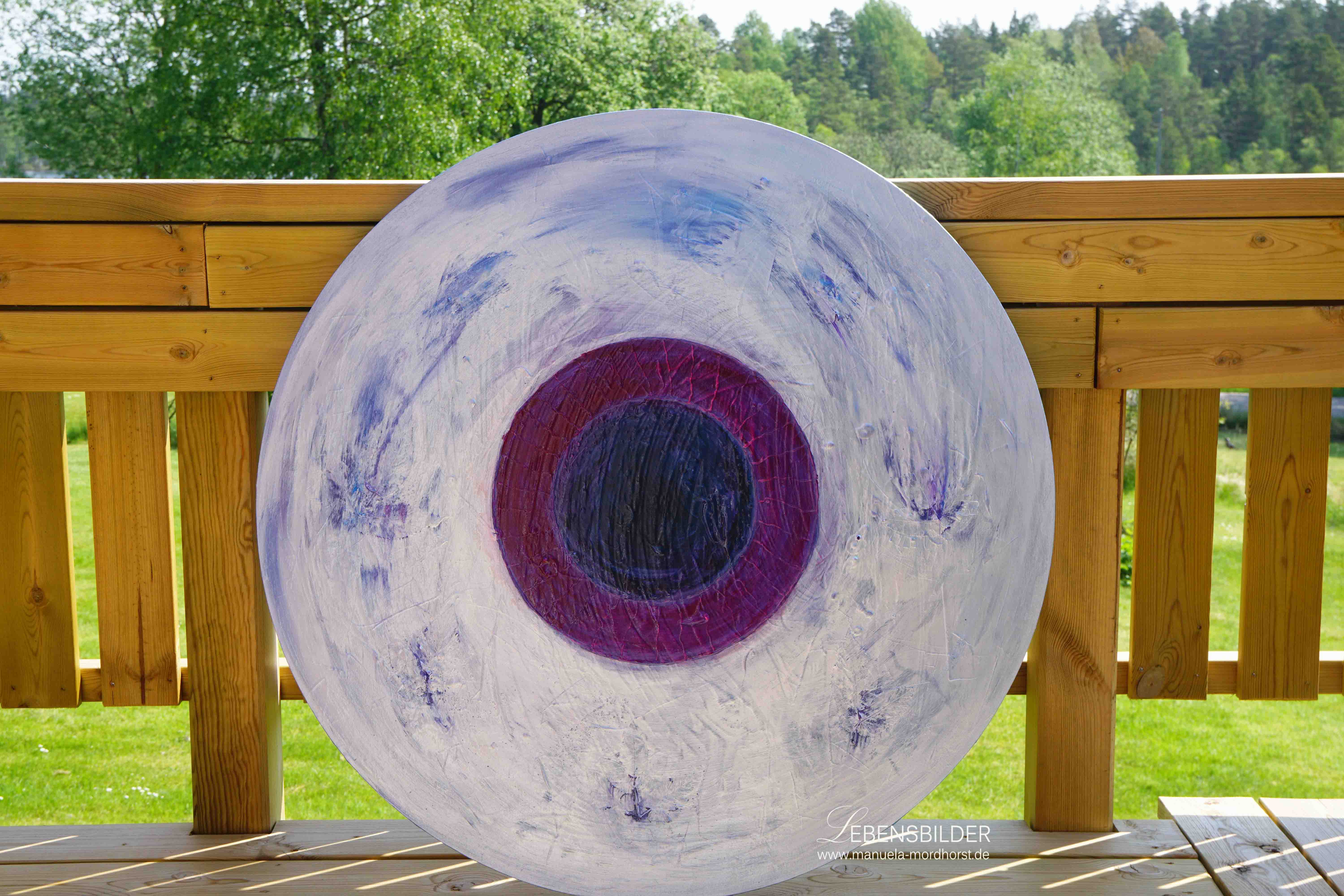 Das Mandala Vitalis ist eines, das mich selbst an ziemliche Grenzen geführt hat. Es hat zig Lagen und war anfangs total bunt, dann wurde es blau und blauer. Auf einem Spaziergang sammelte ich Blätter ein und dachte, die könnte ich doch ggf. für das Bild verwenden. Gesagt, getan. Also in das Bild hineingearbeitet und weitere Schichten darüber gemalt, zwischenzeitlich wurde es gar ganz weiß, dann völlig silbern. Am Ende arbeitete ich die darunterliegenden Schichten wieder Stück für Stück heraus, sodass das Bild mehr Tiefe gewinnen konnte. Wie ein Wirbelsturm eroberte es mich selbst und zog mich in sich, in seine Mitte.