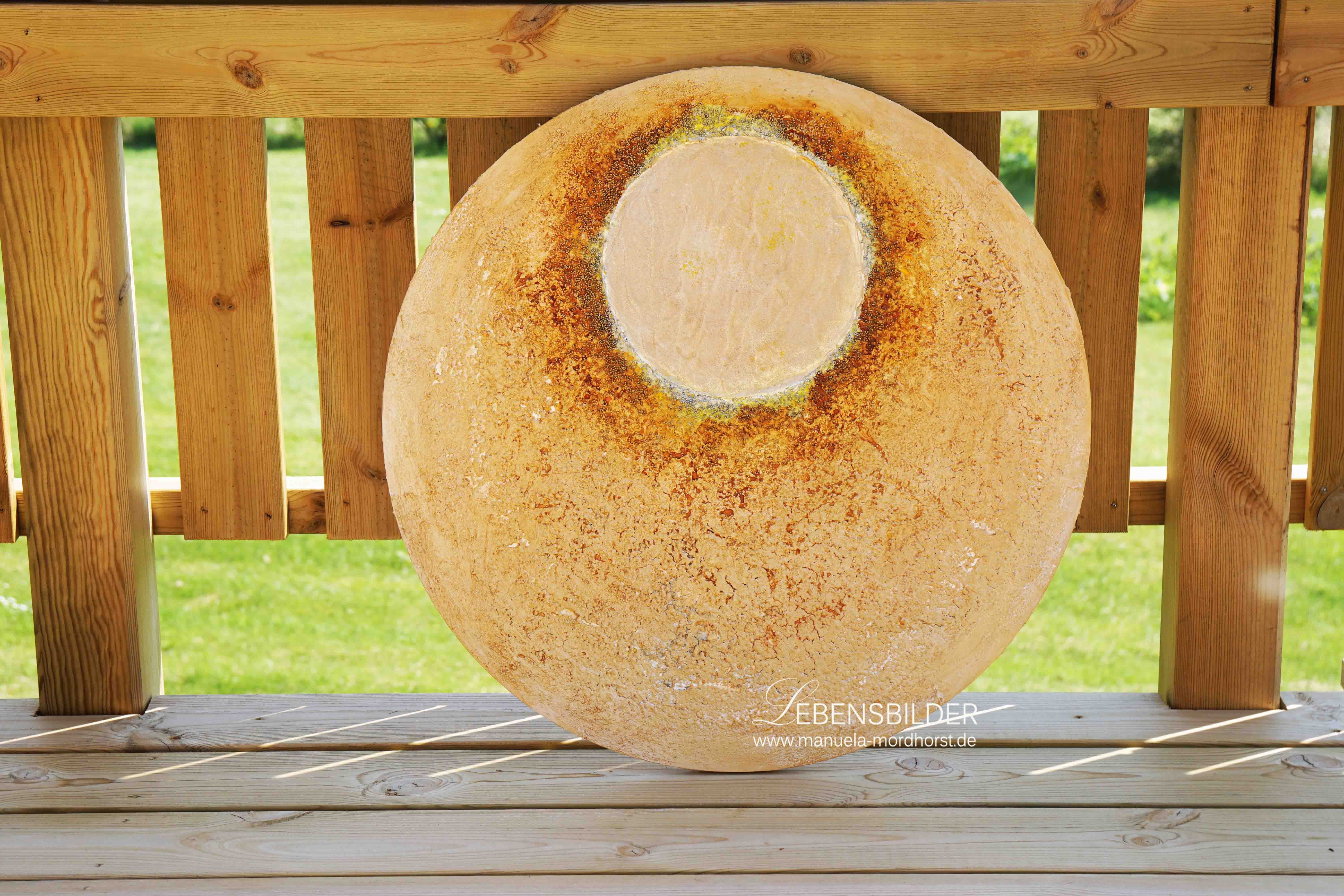 Das Mandala „Urknall“ war auch wieder so ein Bild, das seinen eigenen Kopf durchzusetzen vermochte. 😉 Mit Champagnerkreide und Sumpfkalk als Basis gemischt mit Sanden und Schlacken entstand dieses Bild in gedeckten Tönen, alles ging von Ocker über Weiß und Gelb über, vermengte sich mit Pigmenten, die eingepustet wurden und wurde zu dem, was es nun ist.