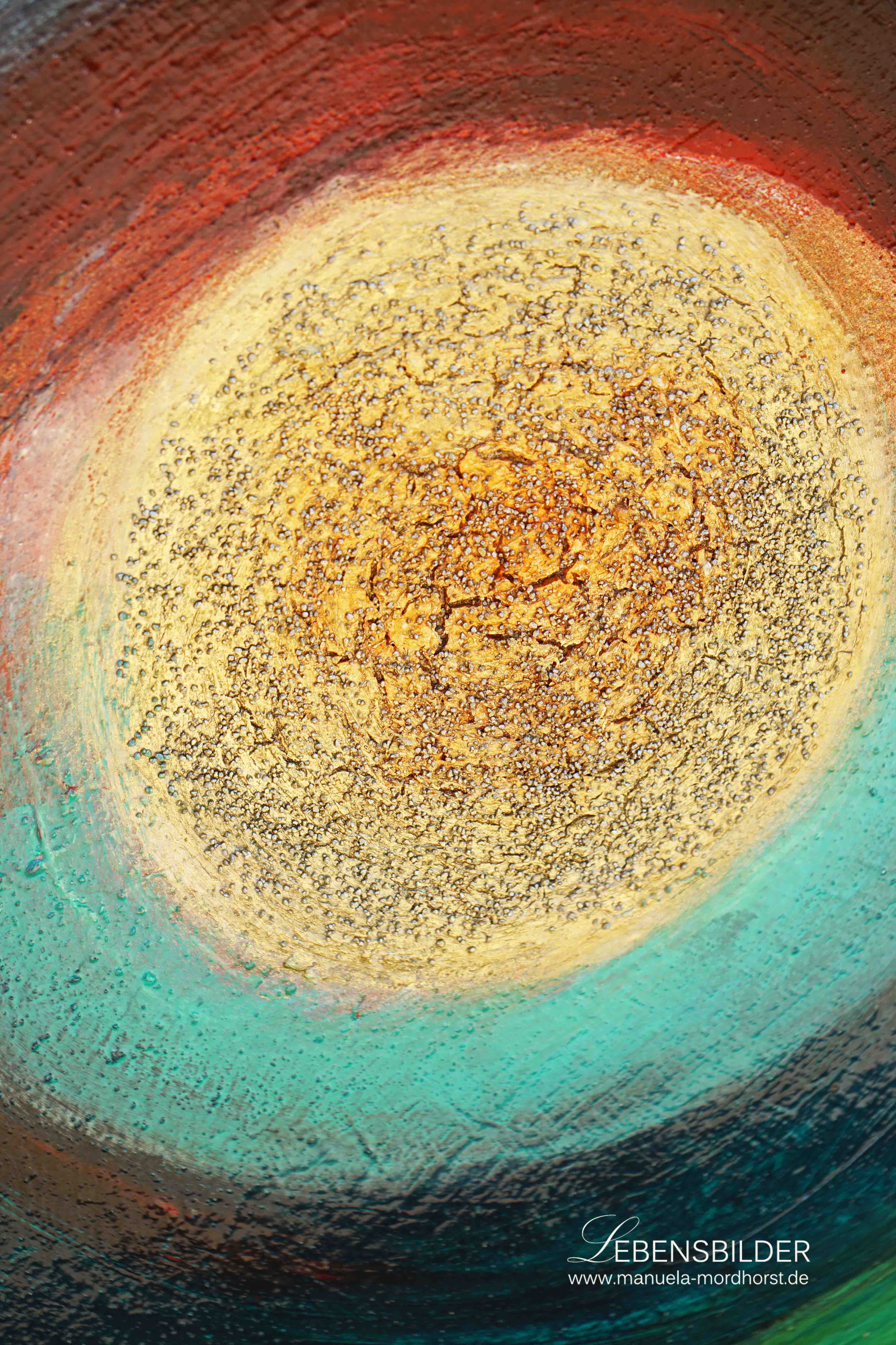 Es wurde dann von mir komplett umgearbeitet und dann nahmen Grüntöne die Oberhand. Ich liess alles einfach „kommen“ wie es kommen wollte. Das Bild hat einen Sogeffekt und genau das war es was mich dann an eine Urkraft denken liess, an etwas sehr Elementares und Ursprüngliches.