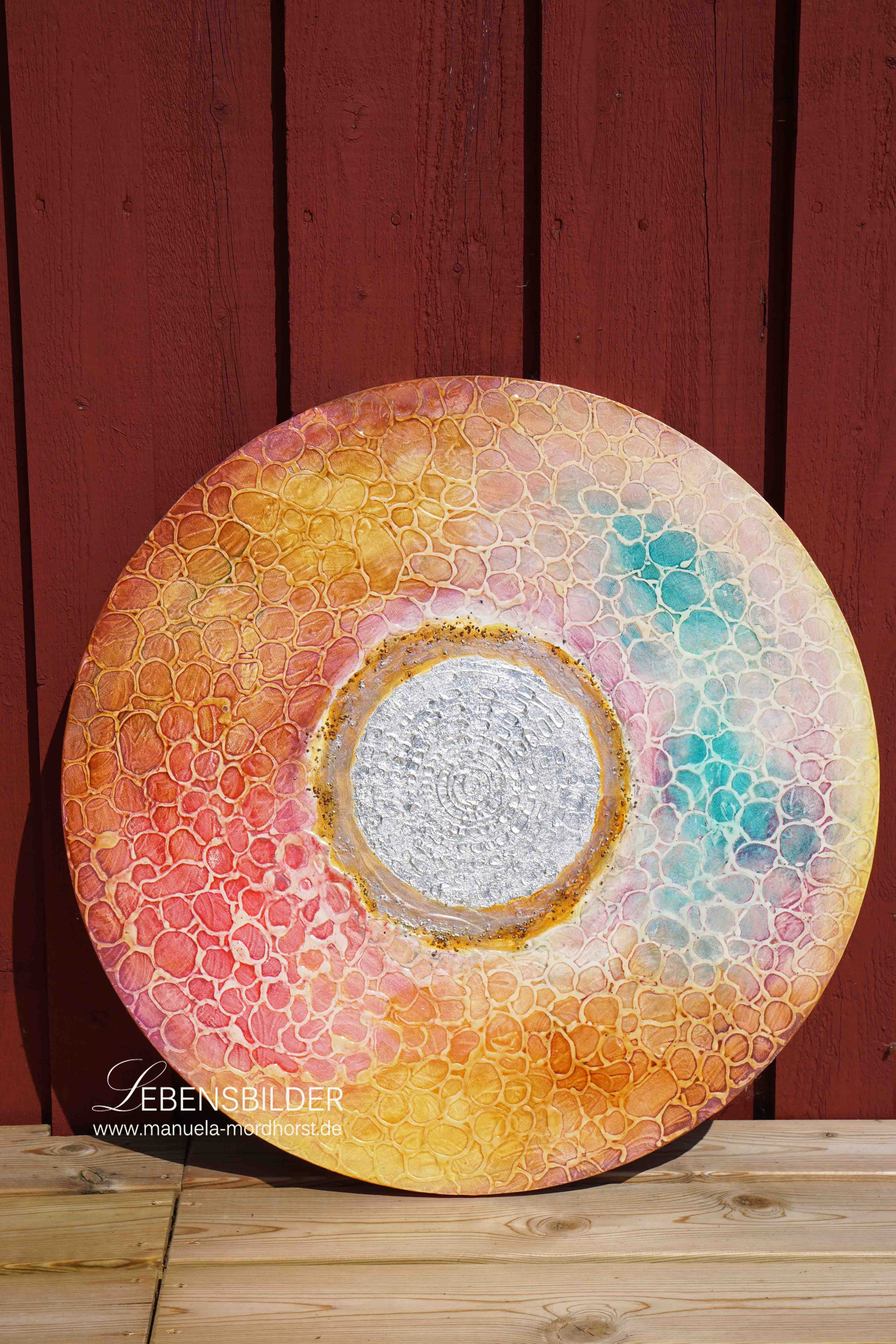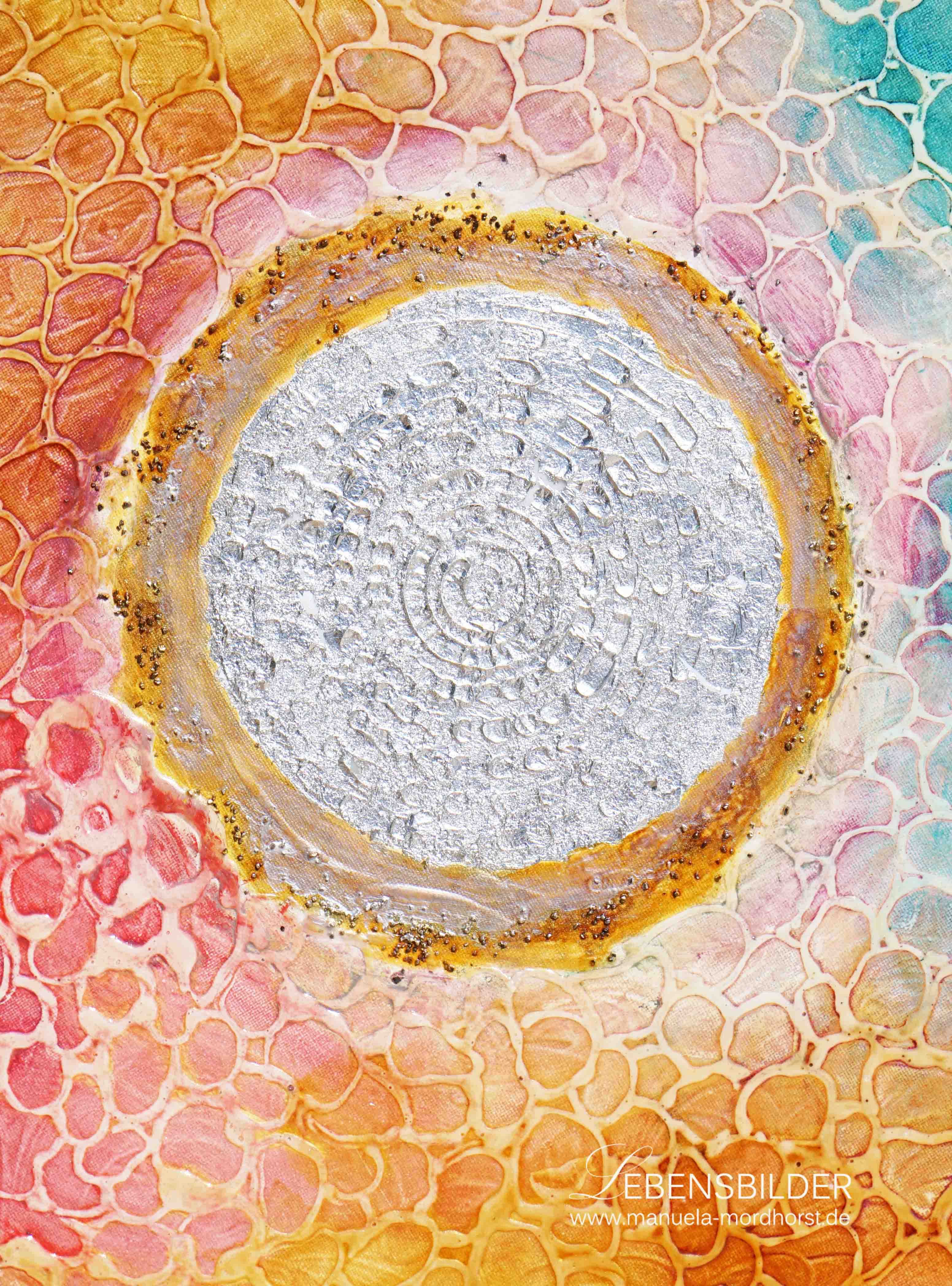 „Circles“ ist wie der Name schon sagt, ein Bild, das sich mit etlichen kleinen Kreisen beschäftigt. In stundenlager Arbeit und seltsamer Haltung habe ich den Binder in einer Spritze auf die Leinwand aufgetragen und immer Kringel gemacht. Das Ganze habe ich über die Nacht trocknen lassen und als es durchgetrocknet war, konnte das Bild weiterbearbeitet werden. Anfangs habe ich die mittige Spirale herausgearbeitet und darauf dann silberfarbenes Schlagmetall aufgebracht, der Rest entstand dann wie von selbst. Ich hatte immer den Regenbogen vor Augen und die herrlichen Farbstimmungen und Intensitäten der Glaskunst in Schweden. Tags zuvor, bevor ich begann das Bild zu malen, war ich in einer Glashütte und habe mir dort ganz fantastische Glaskunst angesehen, die vor Farben nur so strotzte. Das war also der aufgegriffene Impuls kann man sagen.