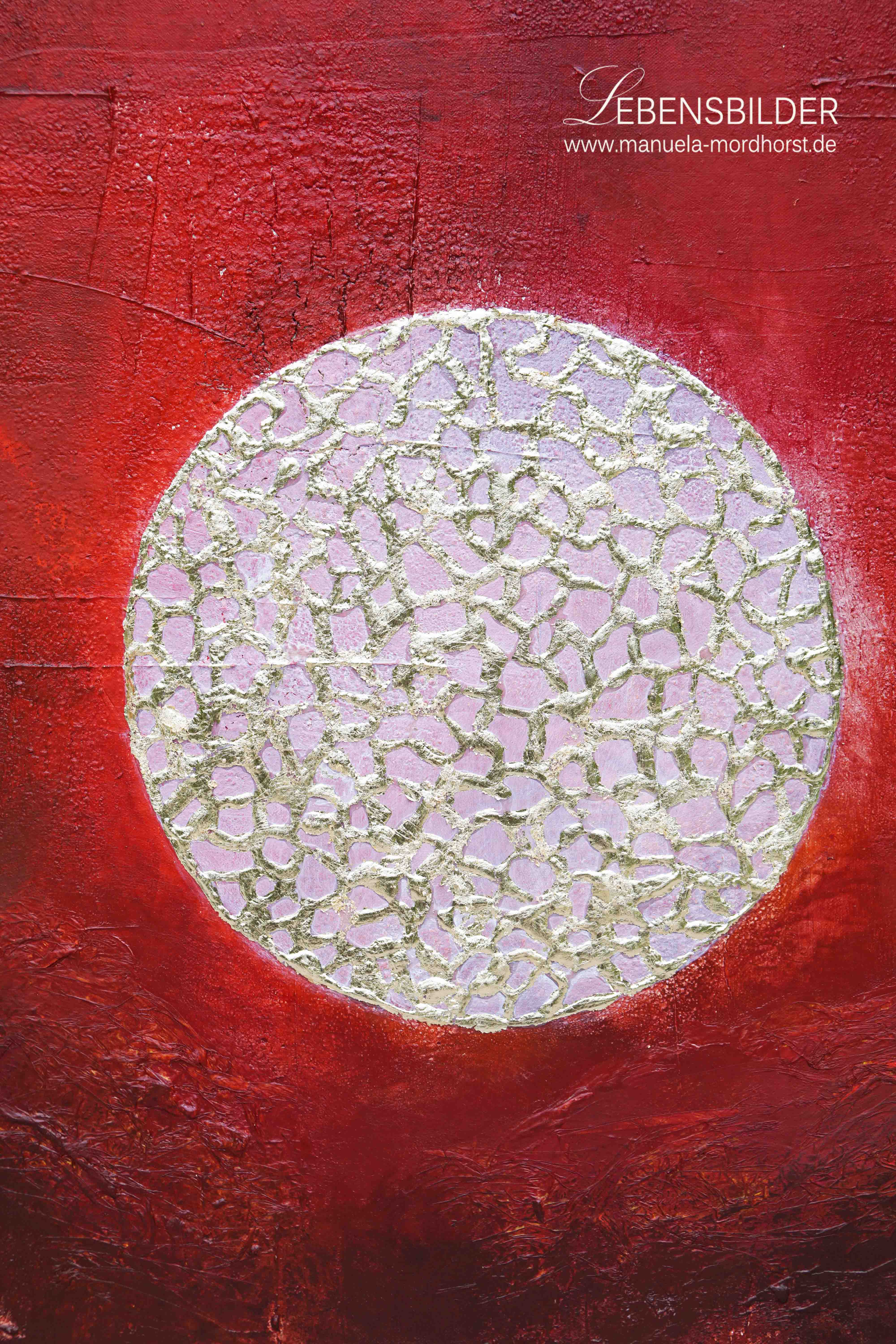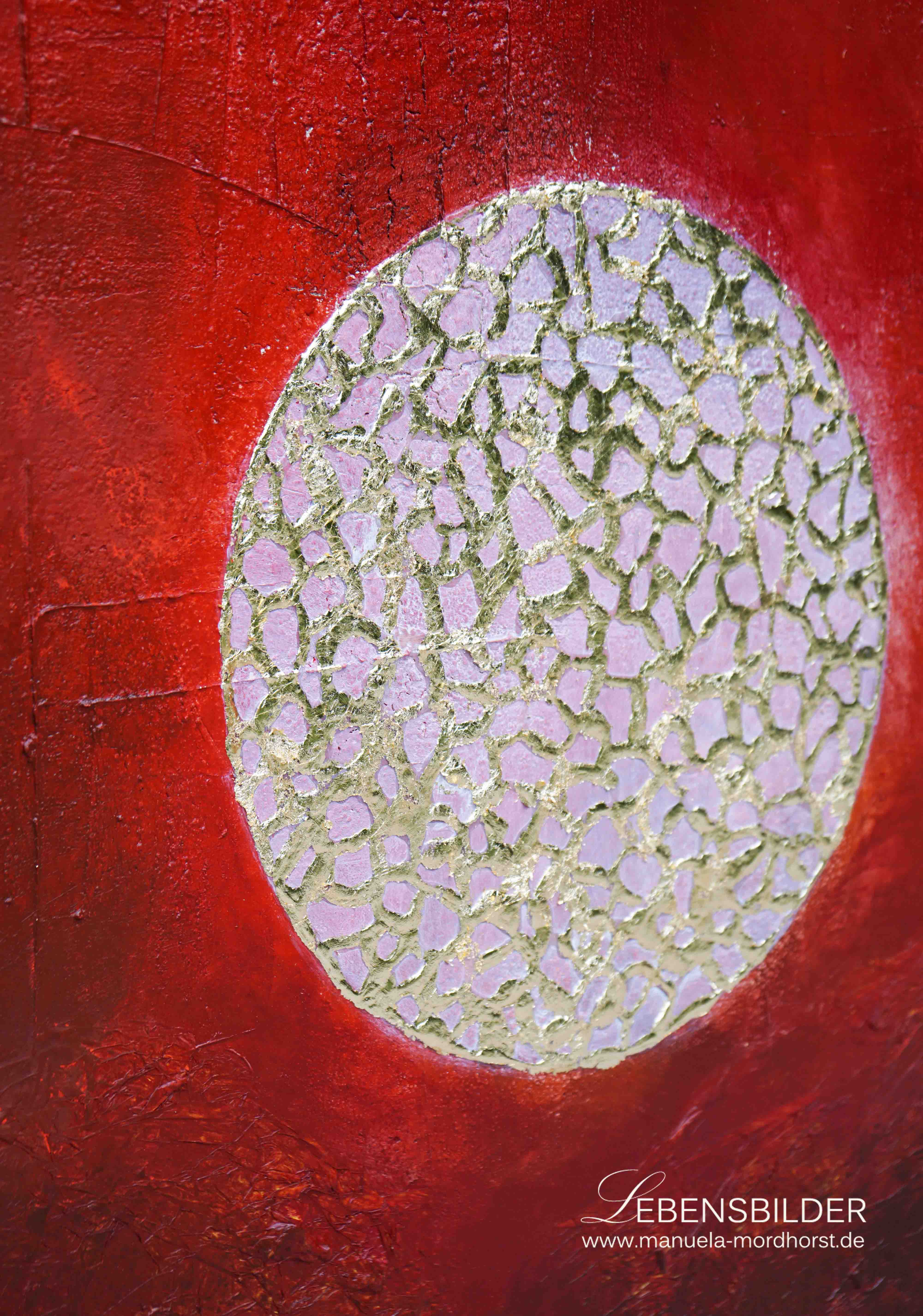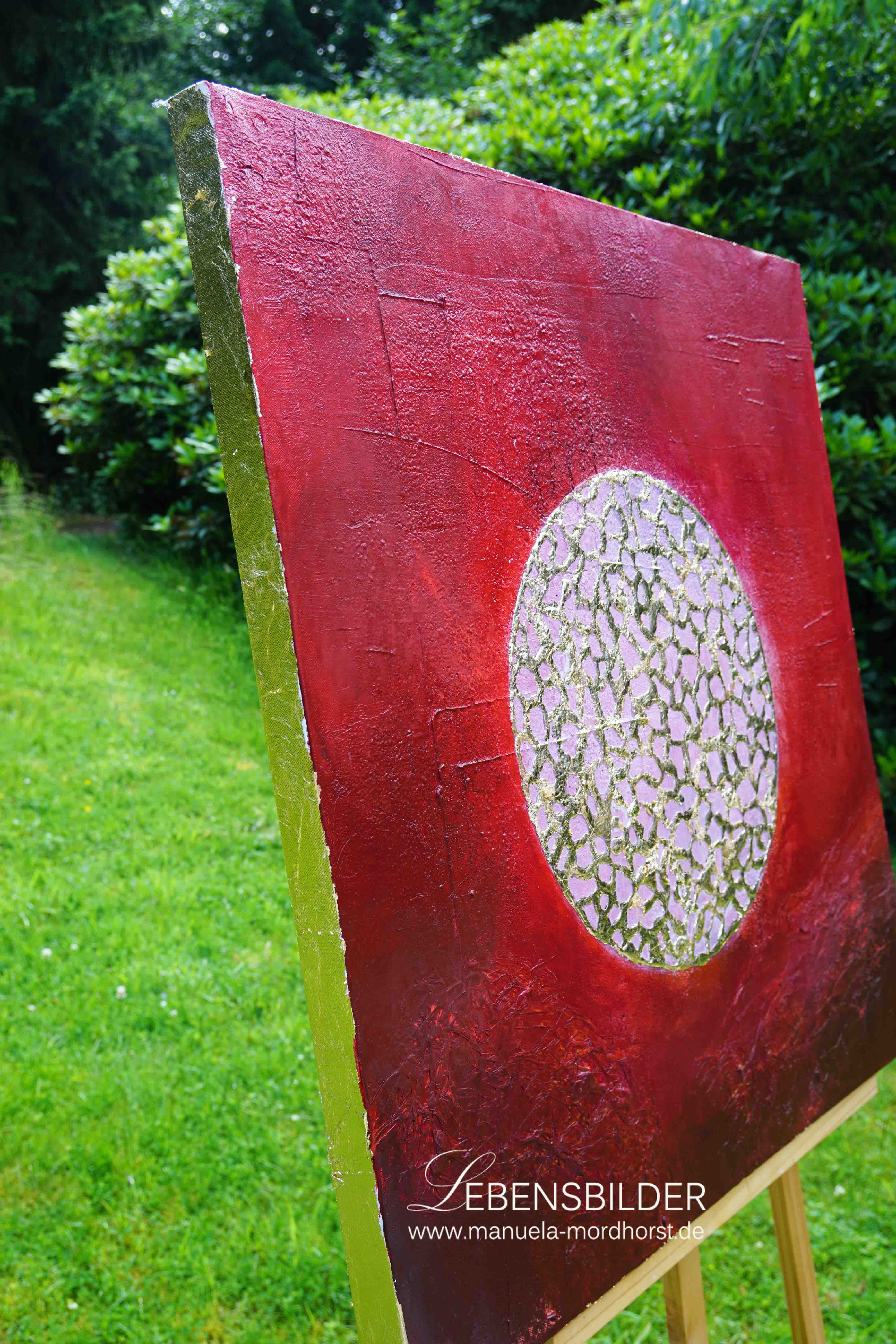 Ganz wie im natürlichen Prozess habe ich als Basisfarbe rot (5 verschiedene Rottöne, die ineinander übergehen) gewählt, um hier die universelle Liebe, aber eben auch das Leben (pulsierendes Blut) zu skizzieren.