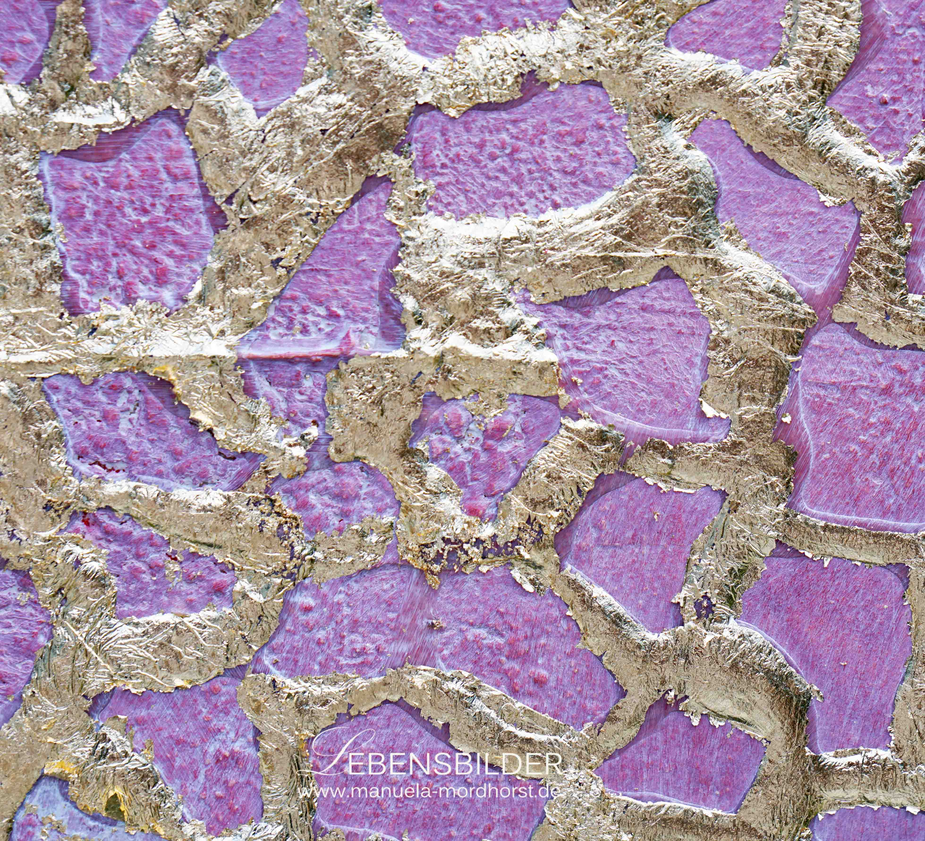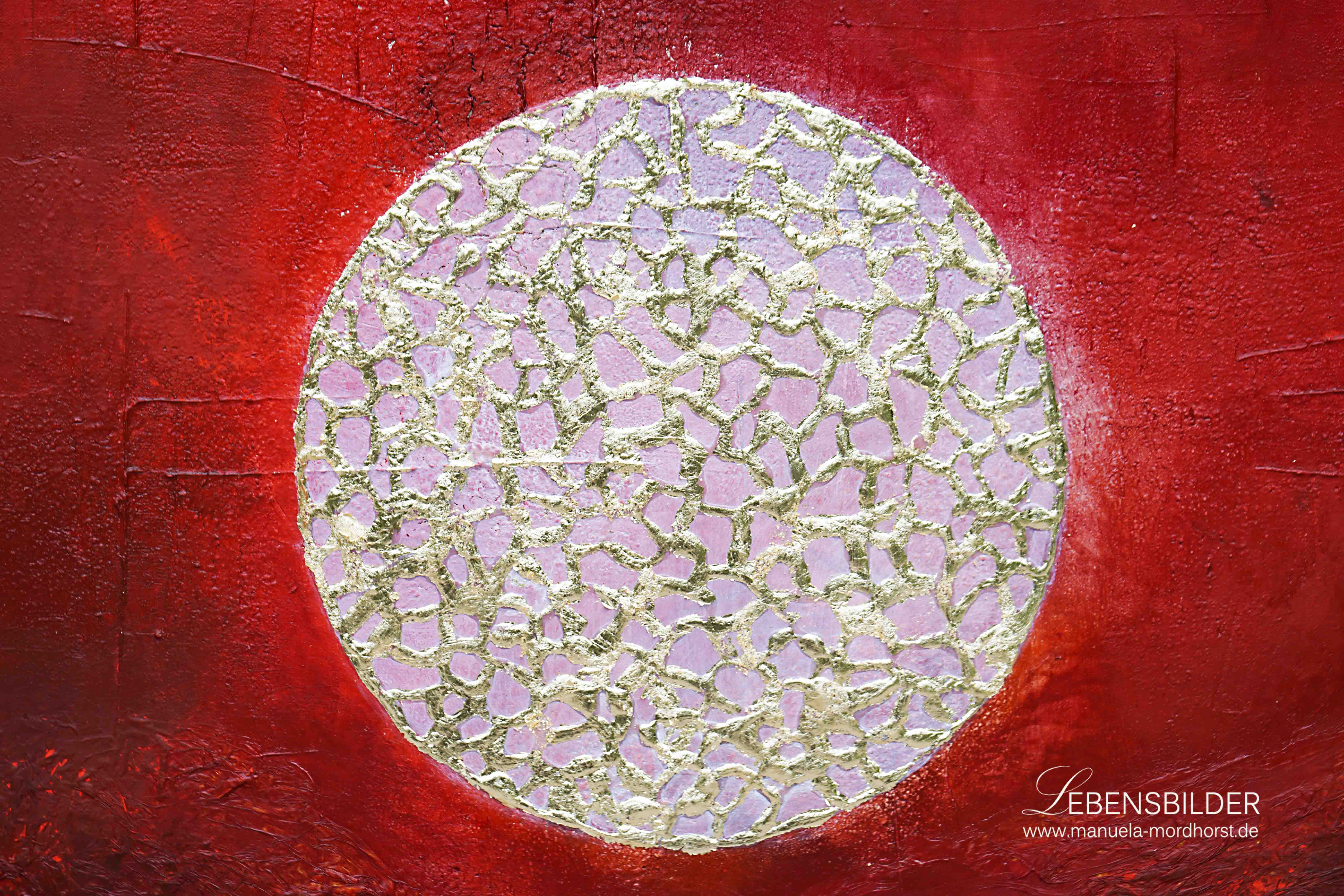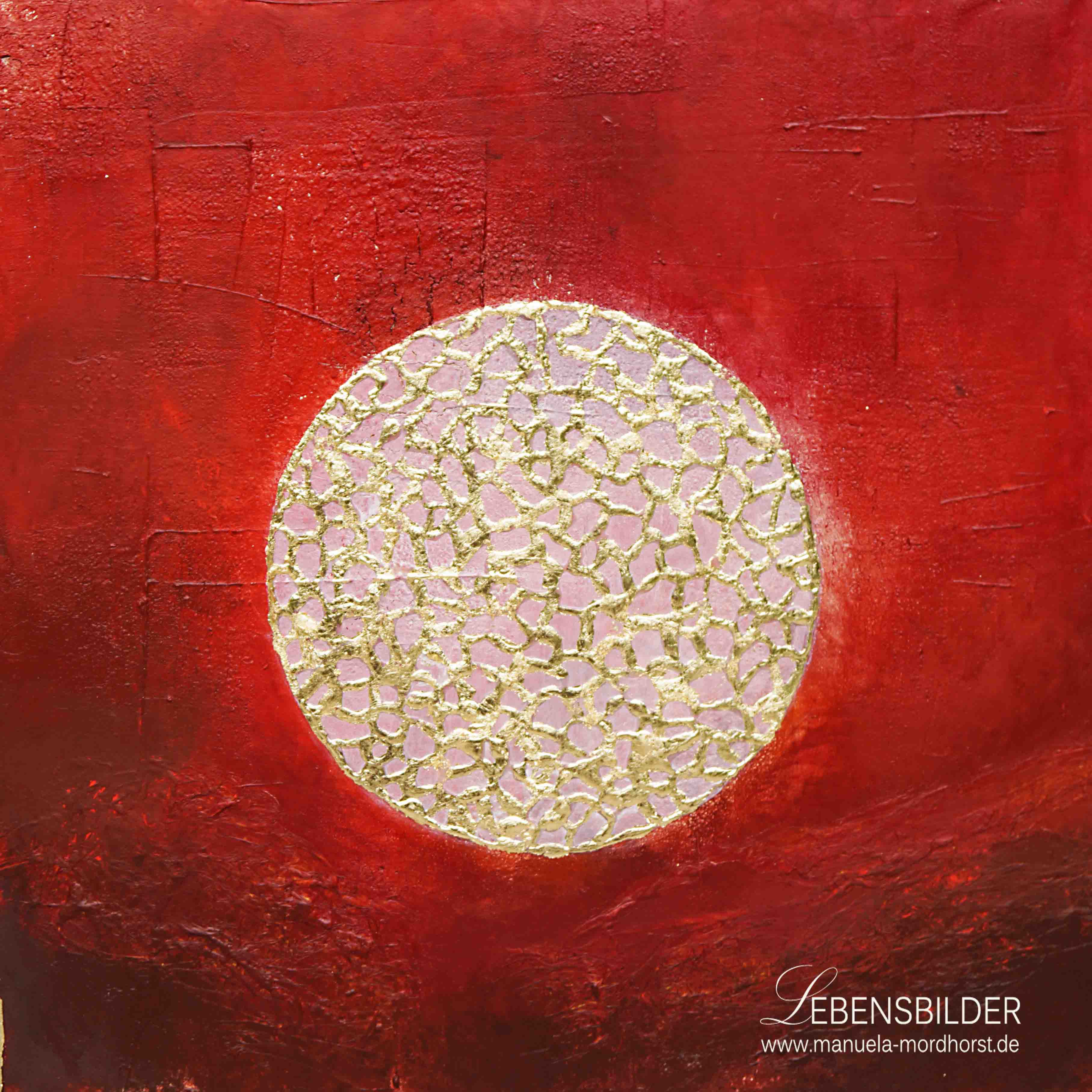 Ganz wie im natürlichen Prozess habe ich als Basisfarbe rot (5 verschiedene Rottöne, die ineinander übergehen) gewählt, um hier die universelle Liebe, aber eben auch das Leben (pulsierendes Blut) zu skizzieren.