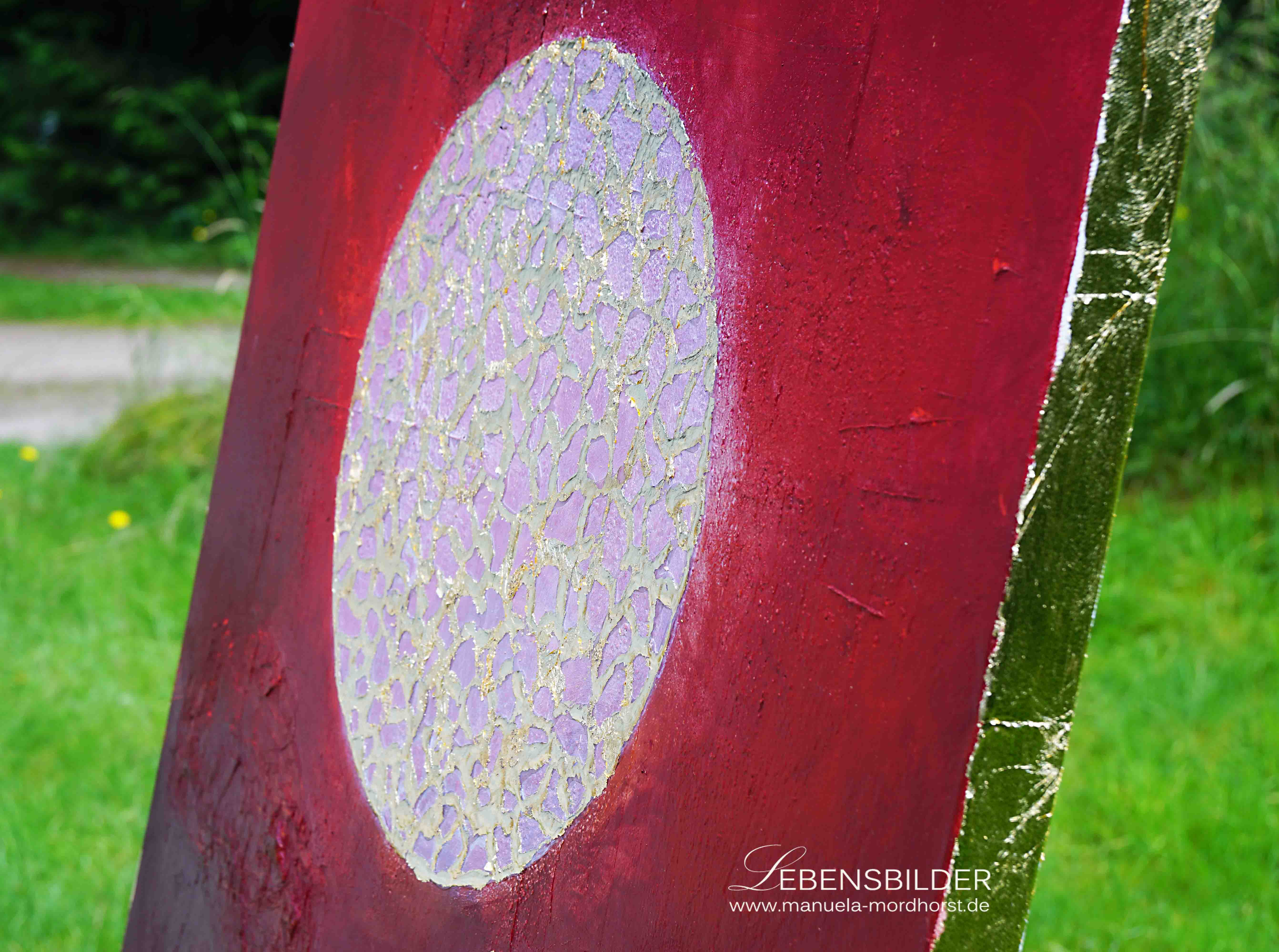 Der Kreis ist in Blattgold gehalten, alles andere basiert auf Champagnerkreide, Leim und Pigmenten, der 4cm breite Rand ist hier ebenfalls mit Blattgold verziert.