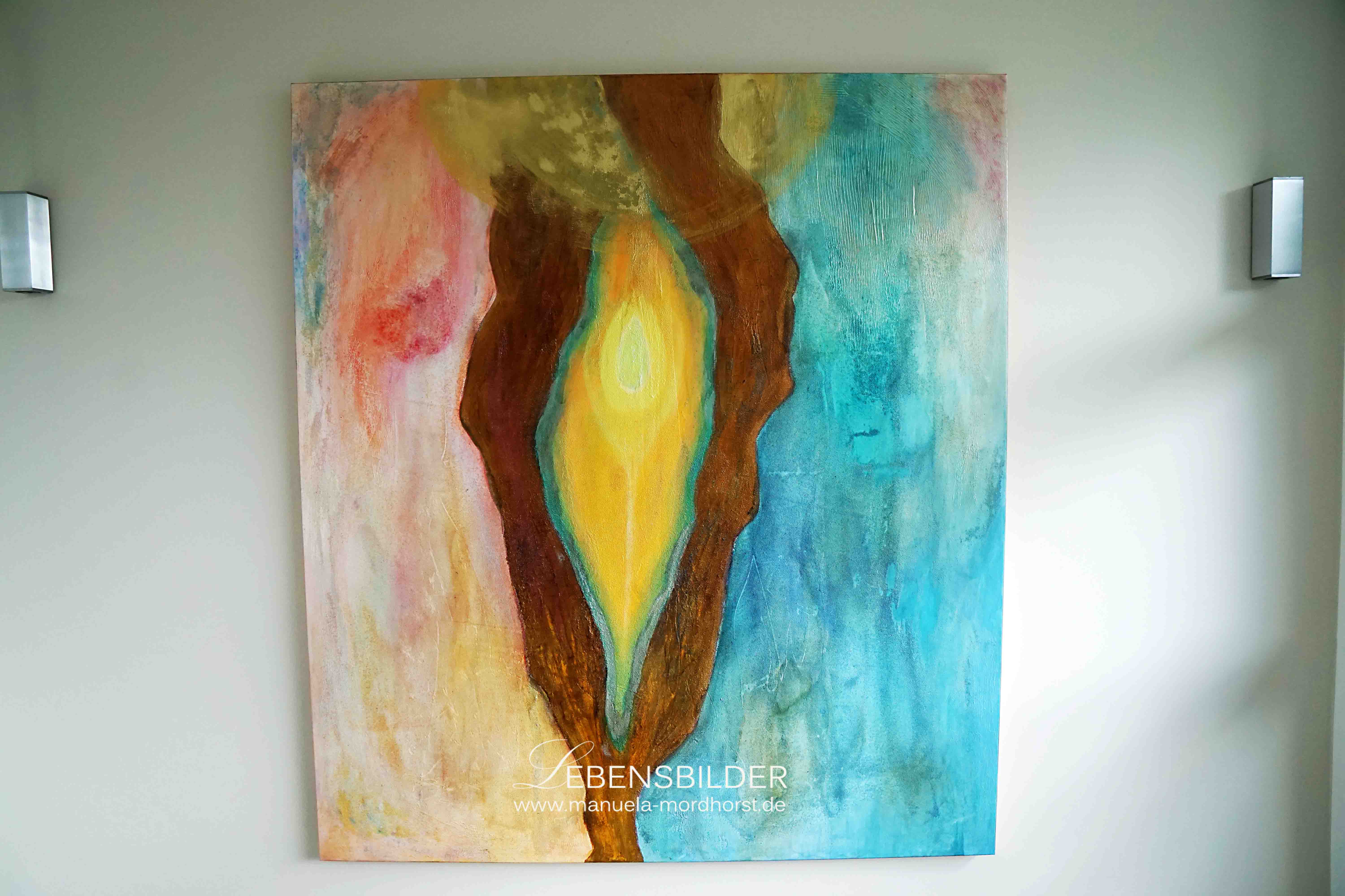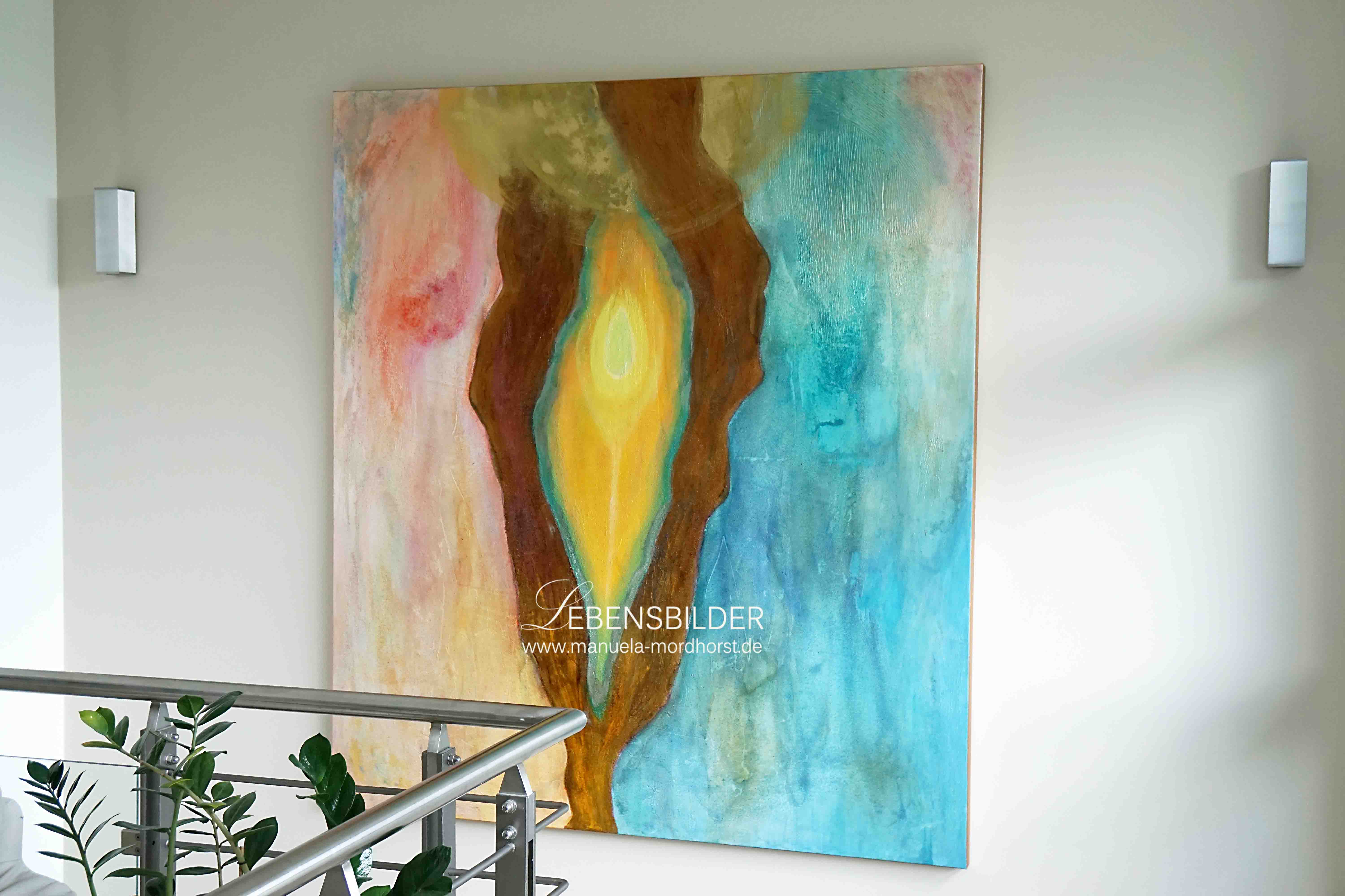 Entschieden haben wir uns dann für 2 doch recht grossformatige Leinwände, einmal in 90x190cm und einmal 180x160cm. Im Juni 2015 holte die Familie beide Werke hier bei mir ab und ich konnte sie nun im Juni anschauen, wie sie nun im neuen Heim wirken und natürlich auch fotografieren. Das habe ich dann auch ausgiebig getan.