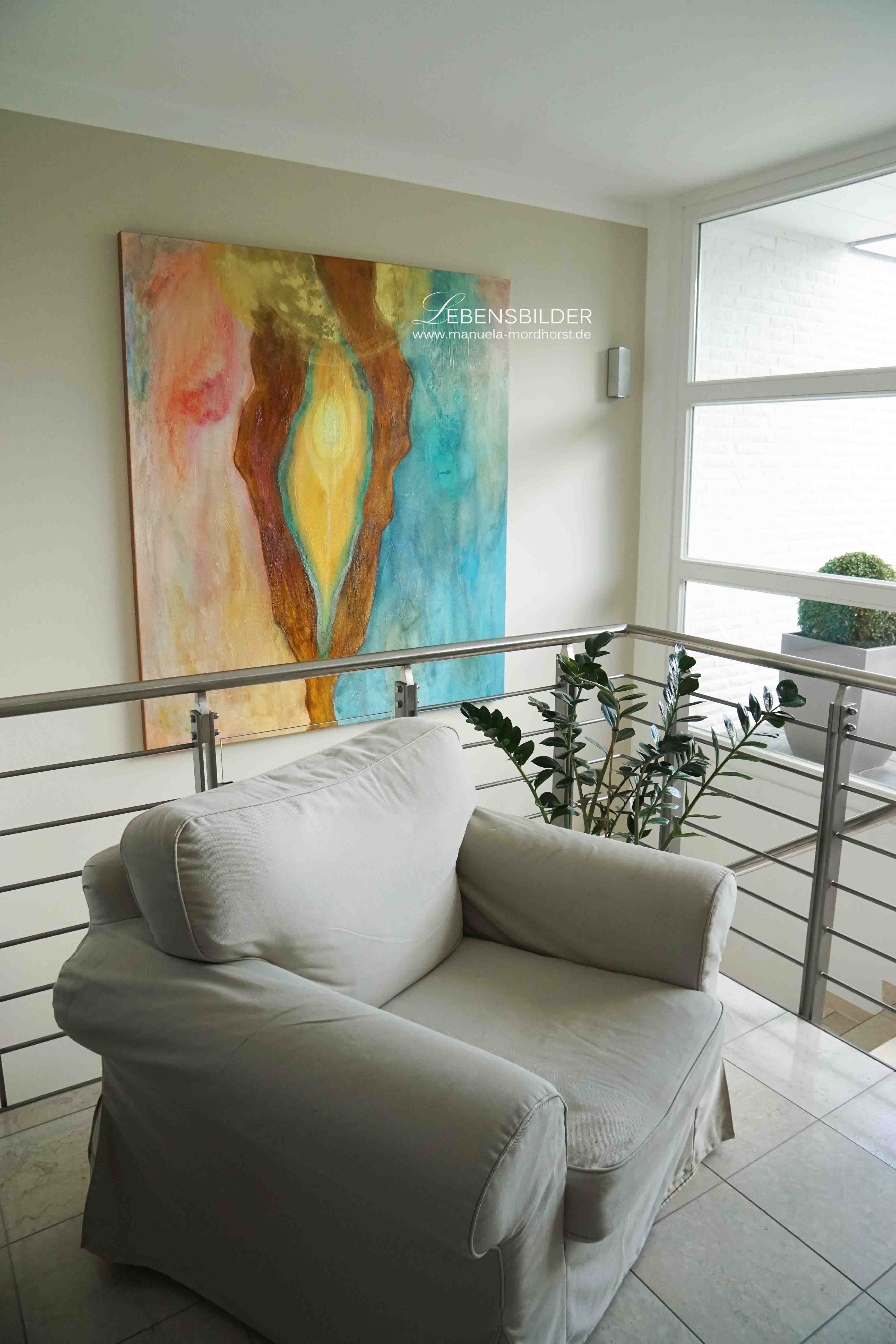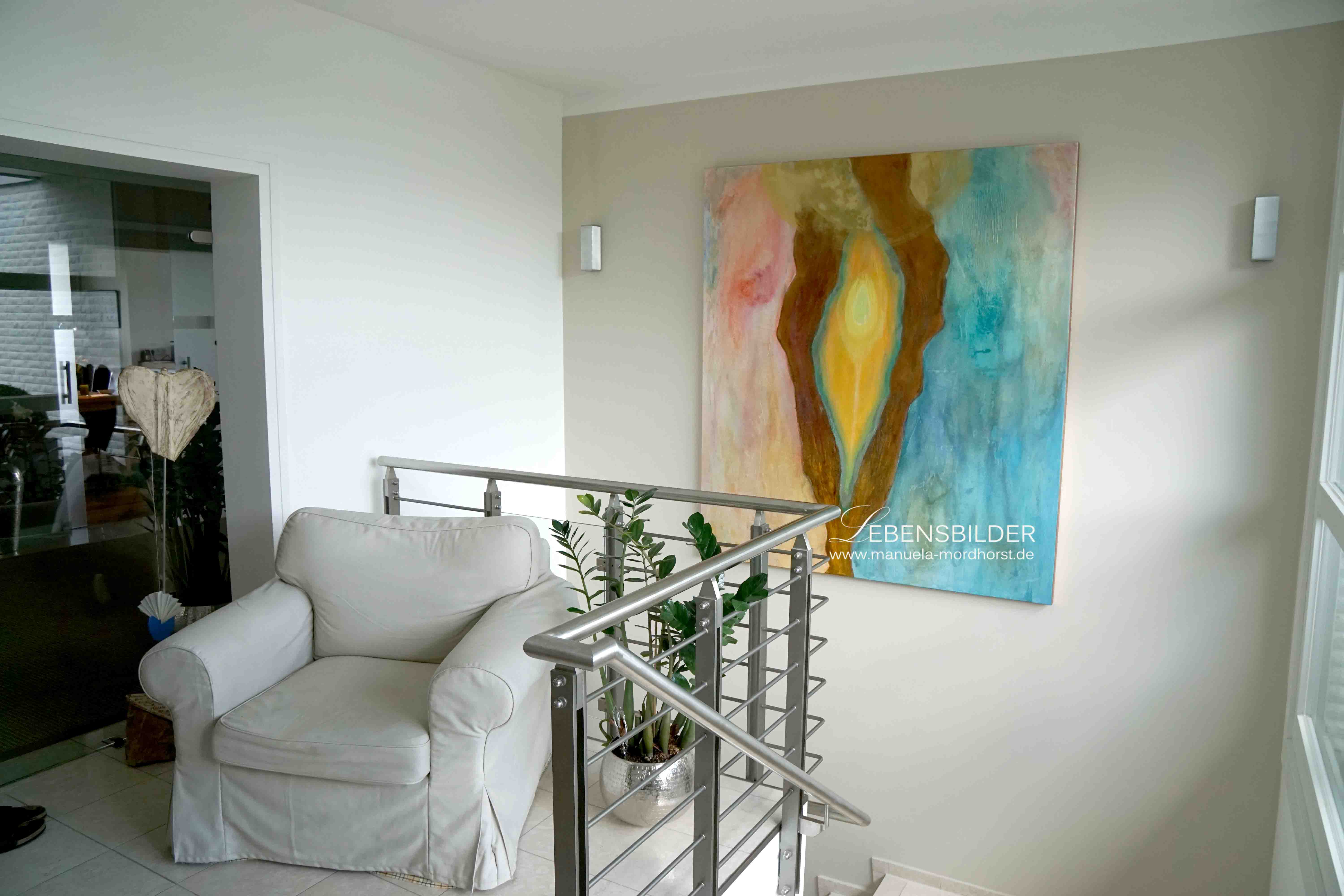 Ich hatte 2014 und 2015 die Ehre für eine liebenswerte 3köpfige Familie 2 Bilder malen zu dürfen. Die Familie war auf mich durch einen 6 seitigen Bericht in einem Hamburger Magazin aufmerksam geworden. Ich hatte freie Hand und durfte mich einfach auf das neue Haus, das ich vorher gesichtet habe, einlassen und malen.