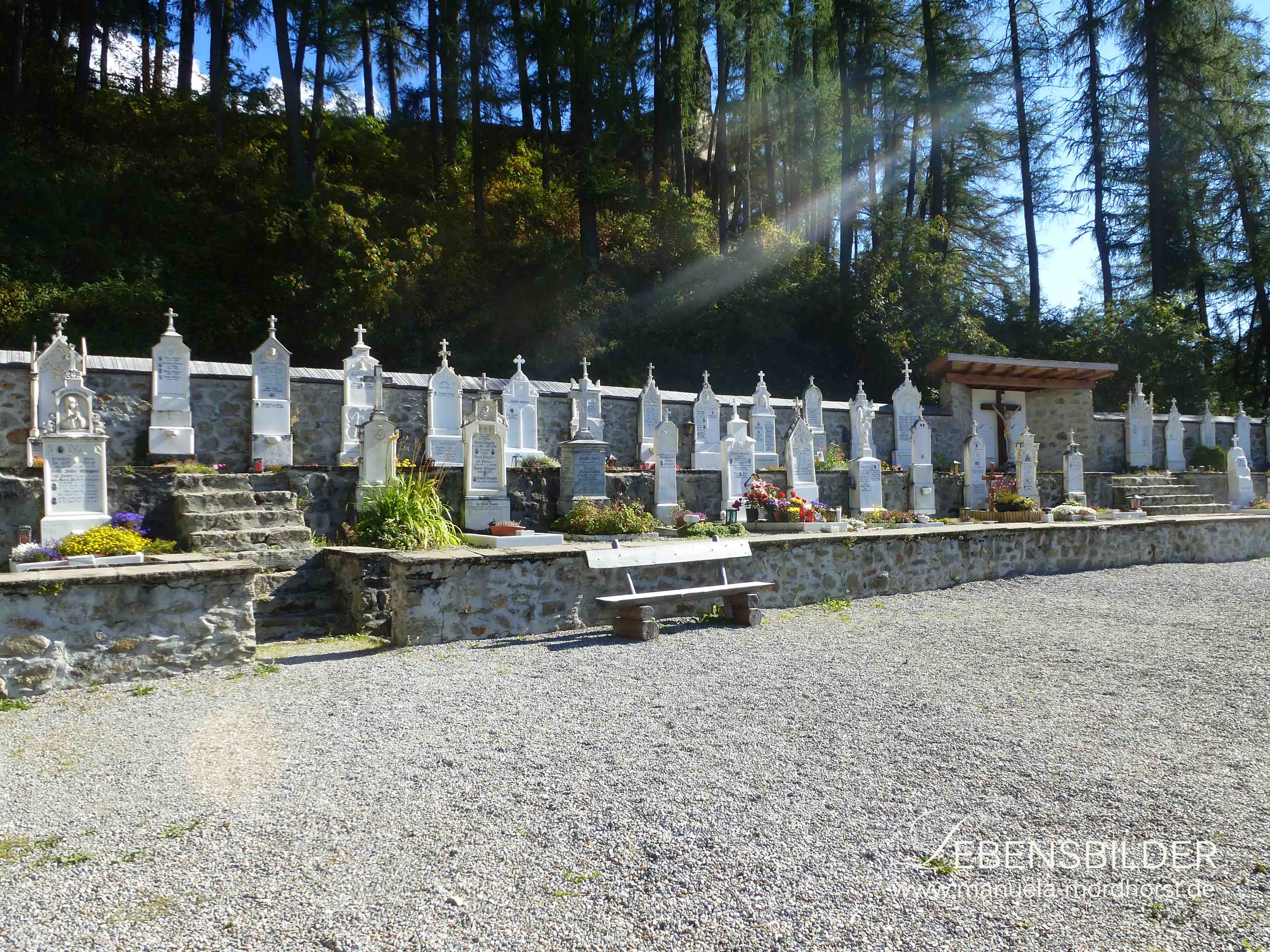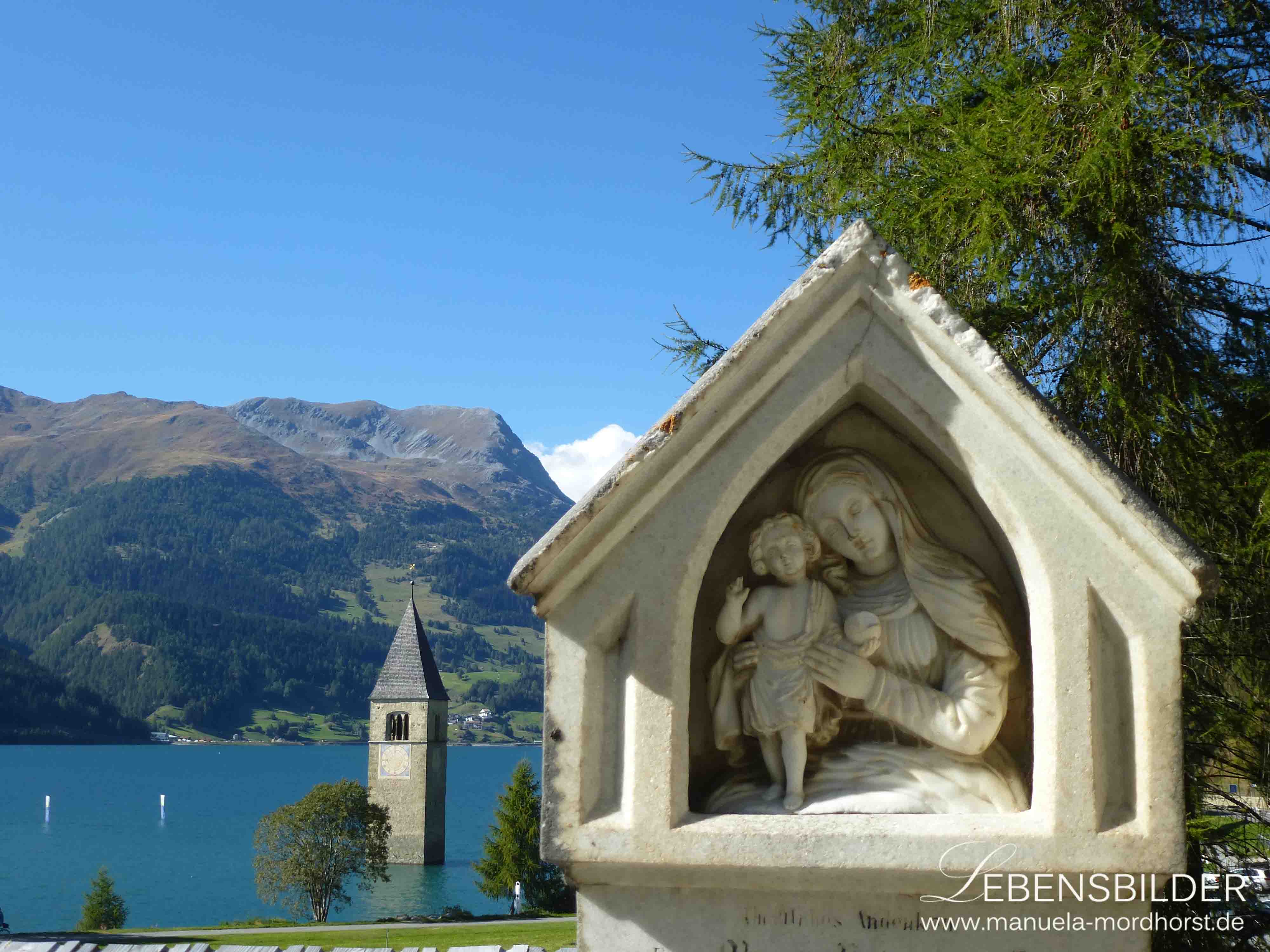 2010 war es kalt, erinnerte ich mich, es lag ein Nebel über allem und der Himmel schien grau. So meine Erinnerung. Dieses Mal war es sonnig, ziemlich heiss und man konnte einen schönen Spaziergang am See entlang unternehmen. Ich veröffentlichte einige Aquarellskizzen dazu schon (Siehe hier). Ein paar Schritte wurden auch getan, aber mich zog es hin zum Friedhof, der direkt am Tunnel liegt und der den Reschensee überblickt. Die Friedhöfe in Österreich und Italien sind sehr schön, sie haben andere Grabgepflogenheiten als wir hier in Deutschland und so gehe ich gerne über Friedhöfe und schaue sie mir in aller Ruhe an. Auch hier: