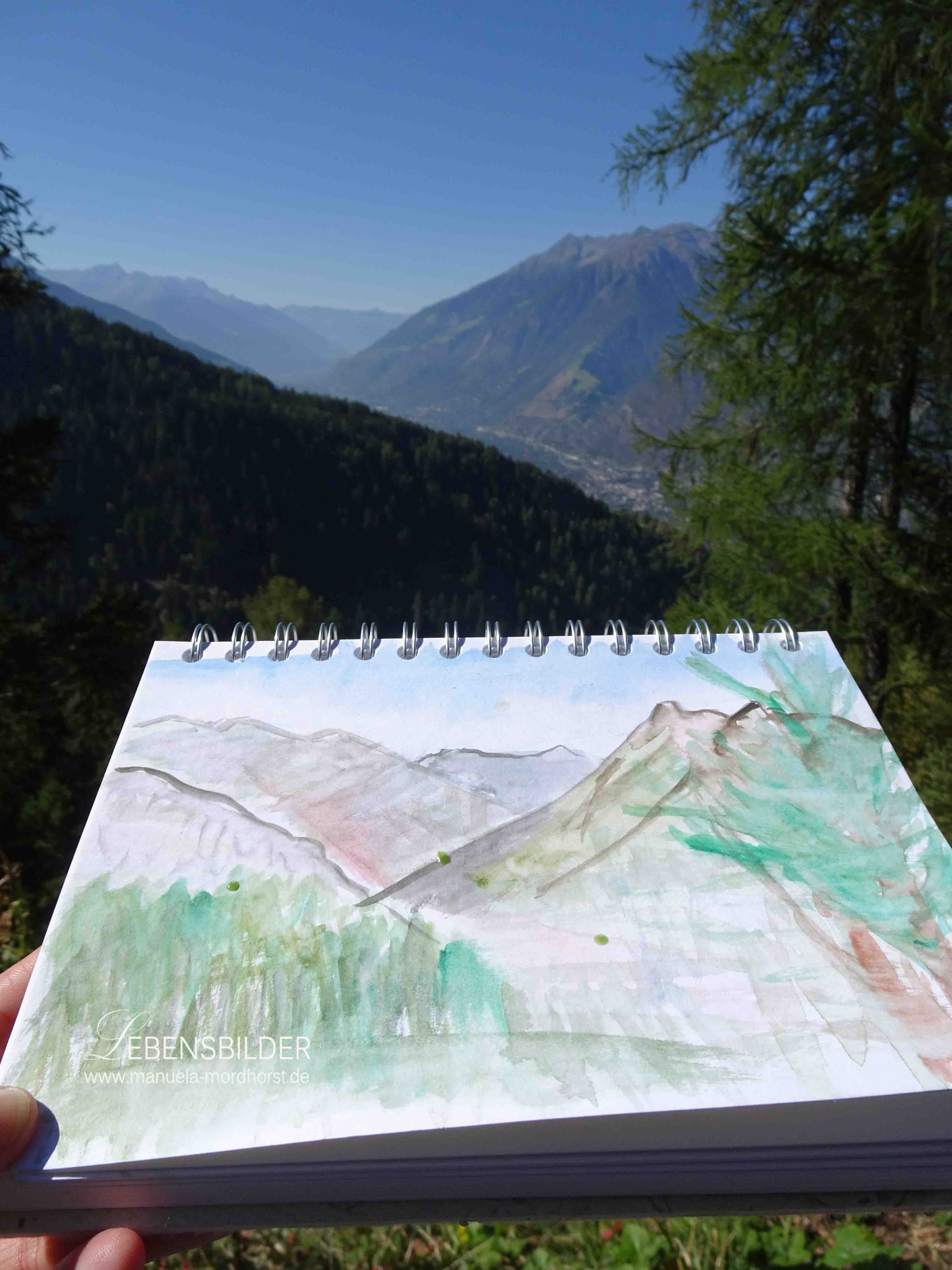 Aschbach war unglaublich schön, aber ein sehr warmer Tag. Man konnte wie ich fand, kaum klar denken und jeder Schritt war eine Herausforderung. Am Kirchlein wurde pausiert und dann weitergewandert, zwischendrin auch mal gemalt.